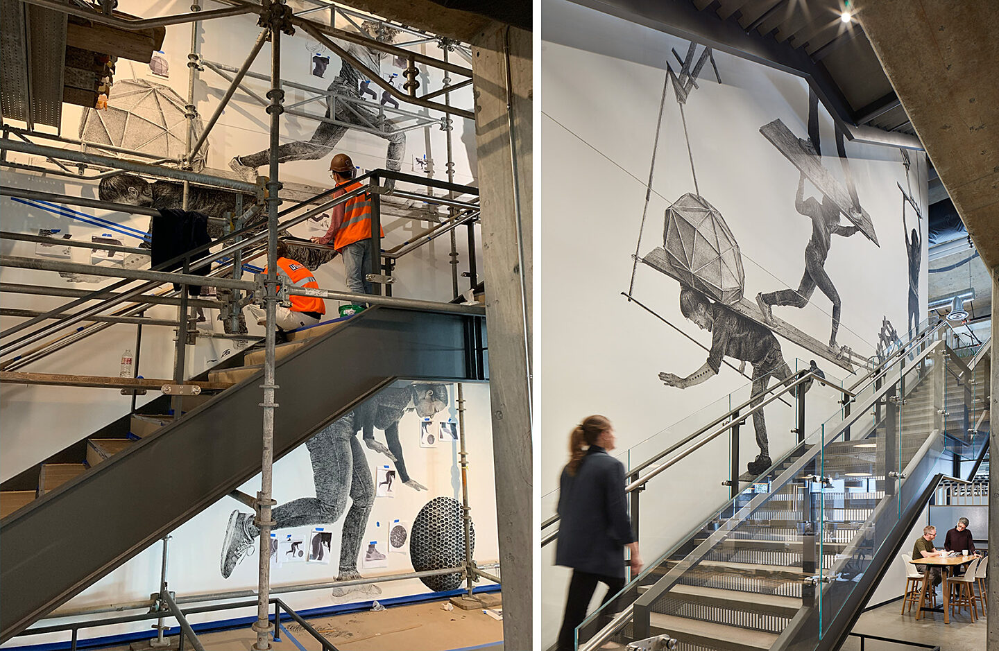 Expedia Group’s Seattle Campus overlooking Elliott Bay provides an attractive, inspiring workplace, graced by four large murals by in-demand New York and Boston artist Ethan Murrow. Some take up one level, and others rise to three levels alongside communicating stairs. Most were drawn by pen directly onto drywall surfaces, guided by projected outlines. Portions were then painted.