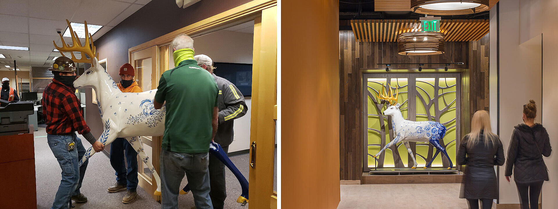 Wedgewood is a life-sized painted ceramic buck, created by artist Petronella Fursman and a treasured Rowley Properties heirloom. Former CEO Skip Rowley bought Wedgewood at a fundraising auction with the idea of placing it outside on the Tibbets Creek Greenway, but it soon became clear Wedgewood needed indoor protection. After years overseeing many meetings in one of the company’s conference rooms, Wedgewood moved to its forever-habitat in Rowley's new 2005 Poplar office building in Issaquah, which is leased to REI.