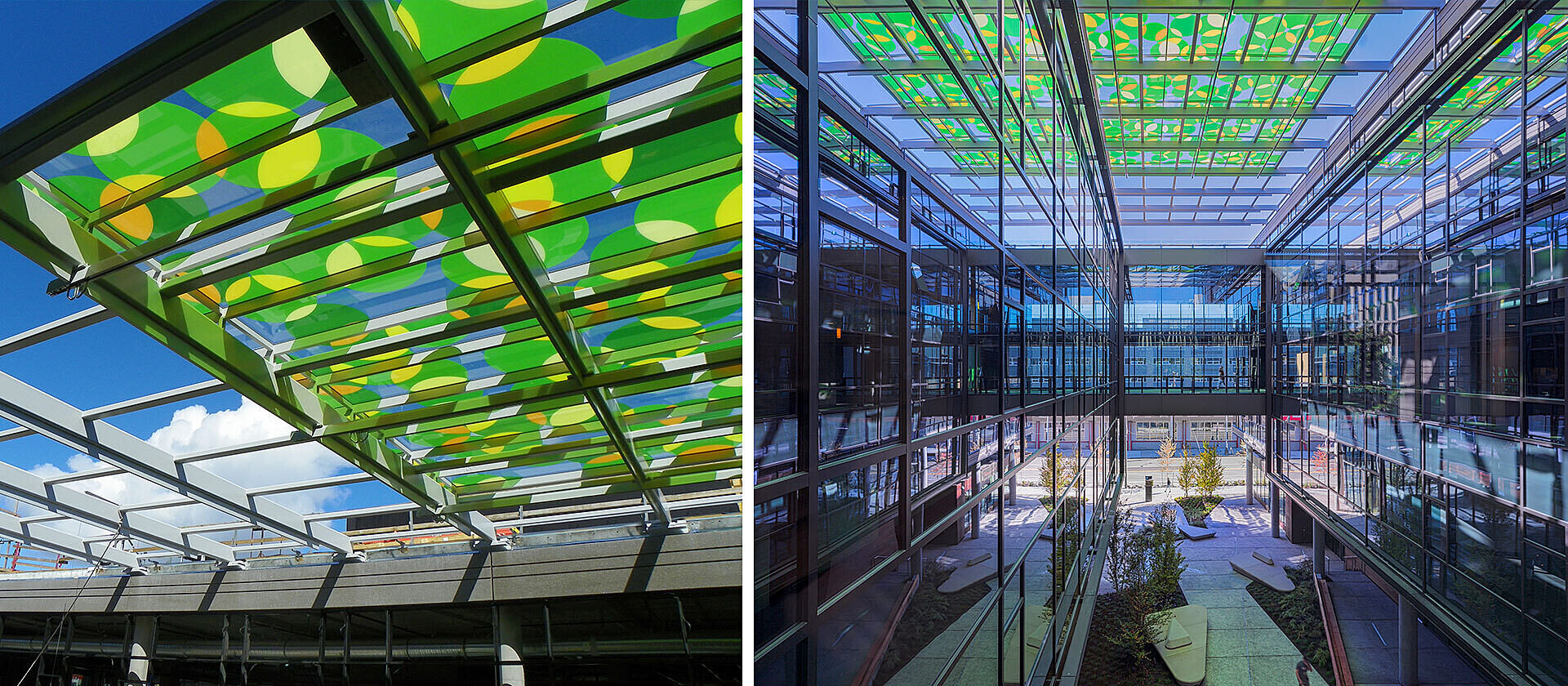 Each panel includes two standard glass plates that sandwich a plastic interlayer with Finch’s design. Similar interlayers are typical for any glass canopy [minus the art] to provide rigidity and prevent breakage.
