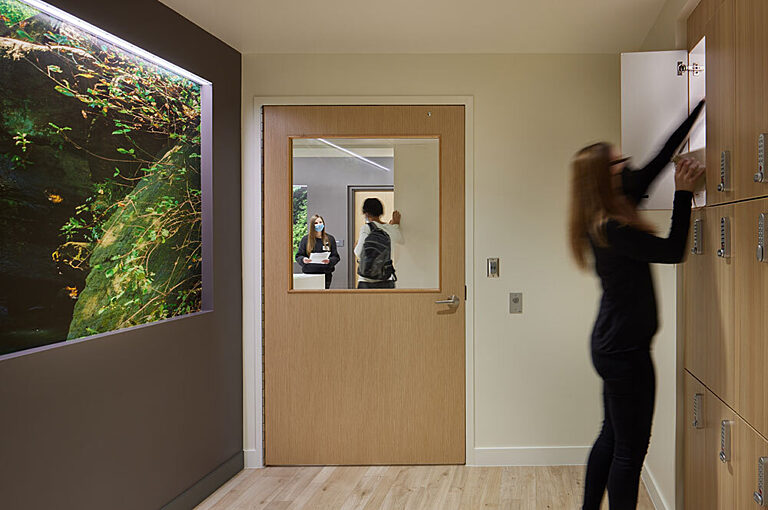Immersive nature photography sets the stage for a positive experience, and transparency through the space lets patients know what to expect. Secure lockers are available for personal items.