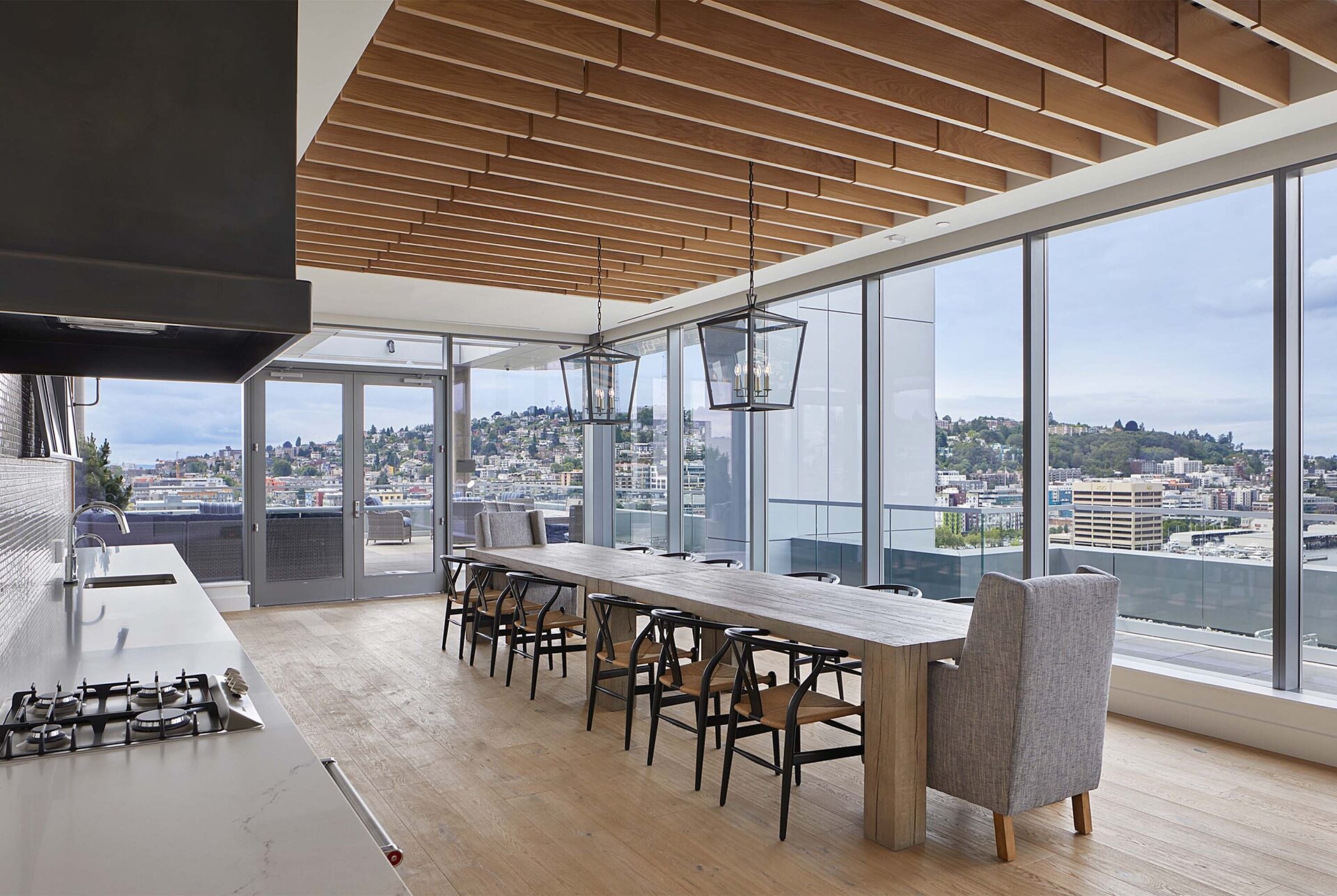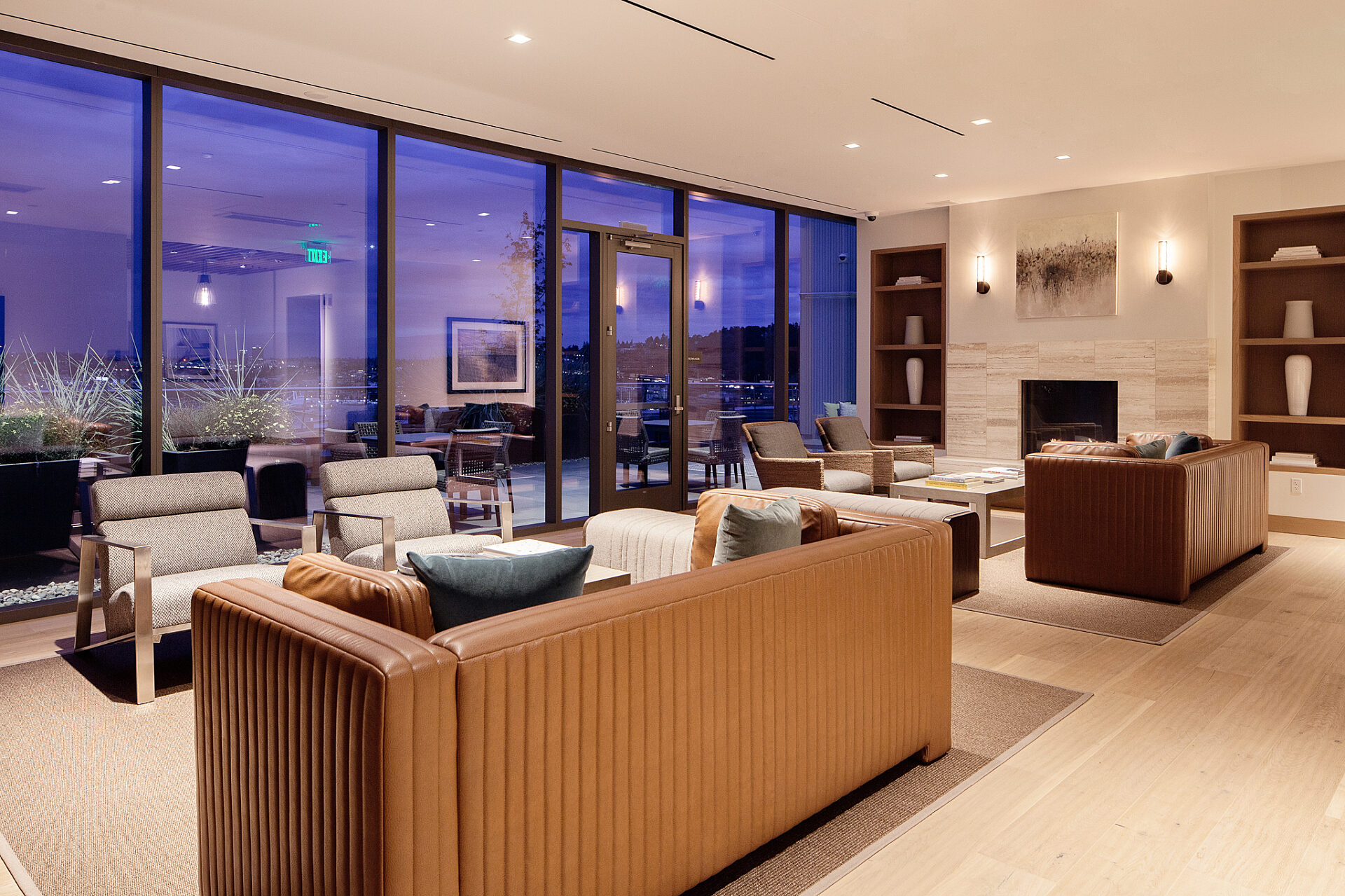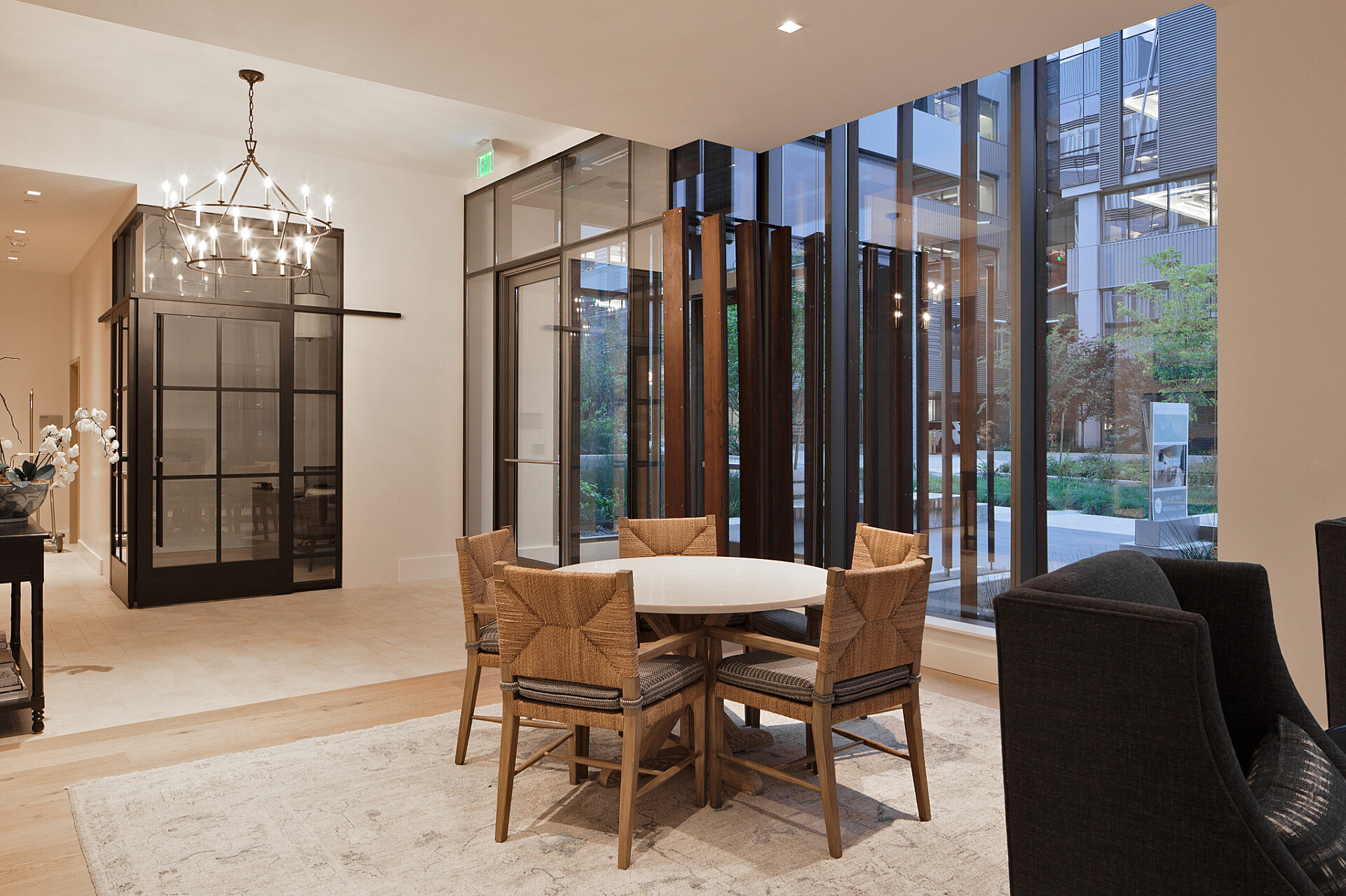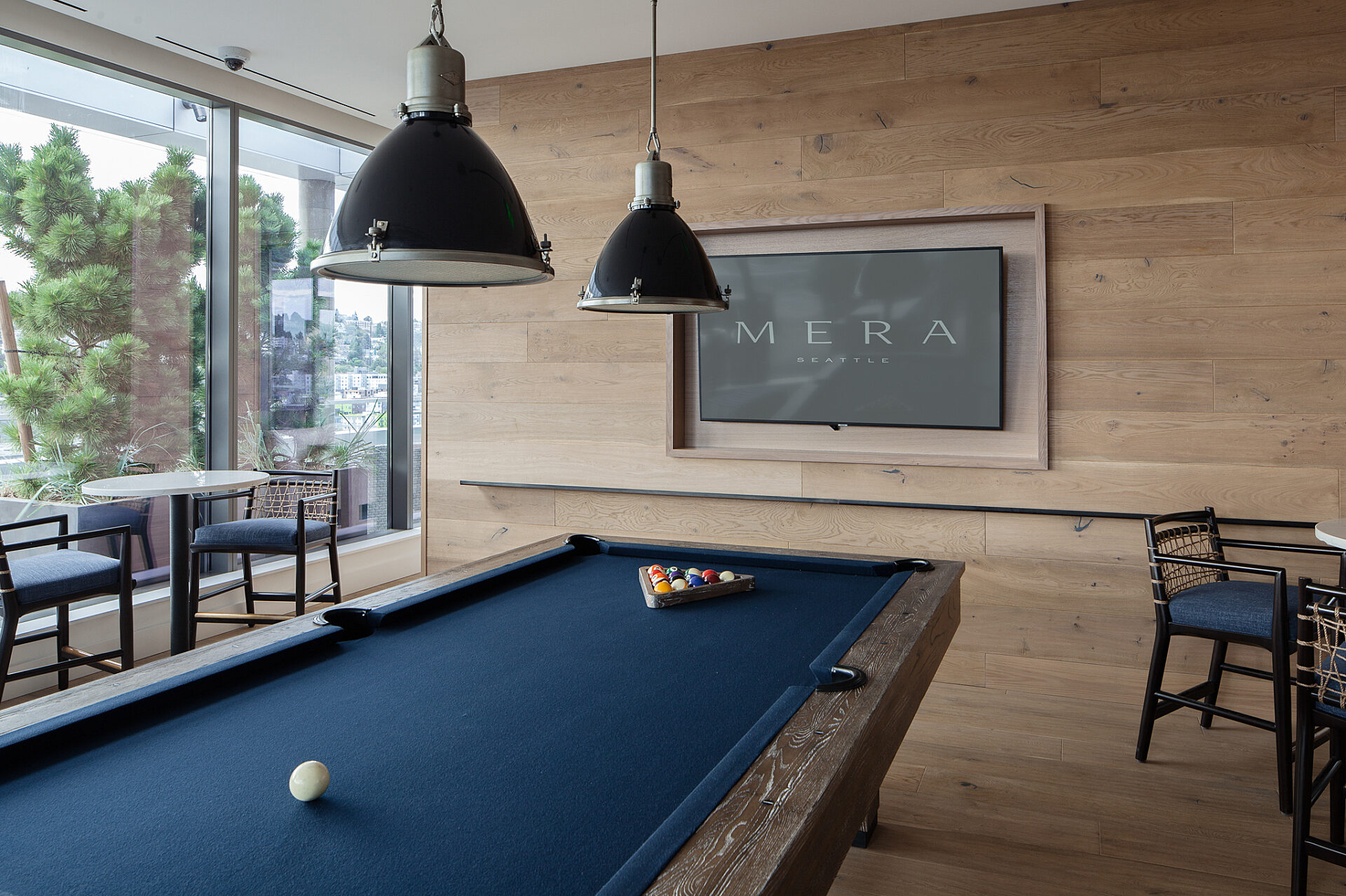 Residential towers—Helm and Mera—sit atop two of the buildings, offering 149 1- and 2-bedroom apartment units with penthouses on the upper floors. Amenity spaces include an expansive roof-top deck with a great room, workout facilities, dog run, dedicated elevators, and secured private vehicle and bicycle parking.