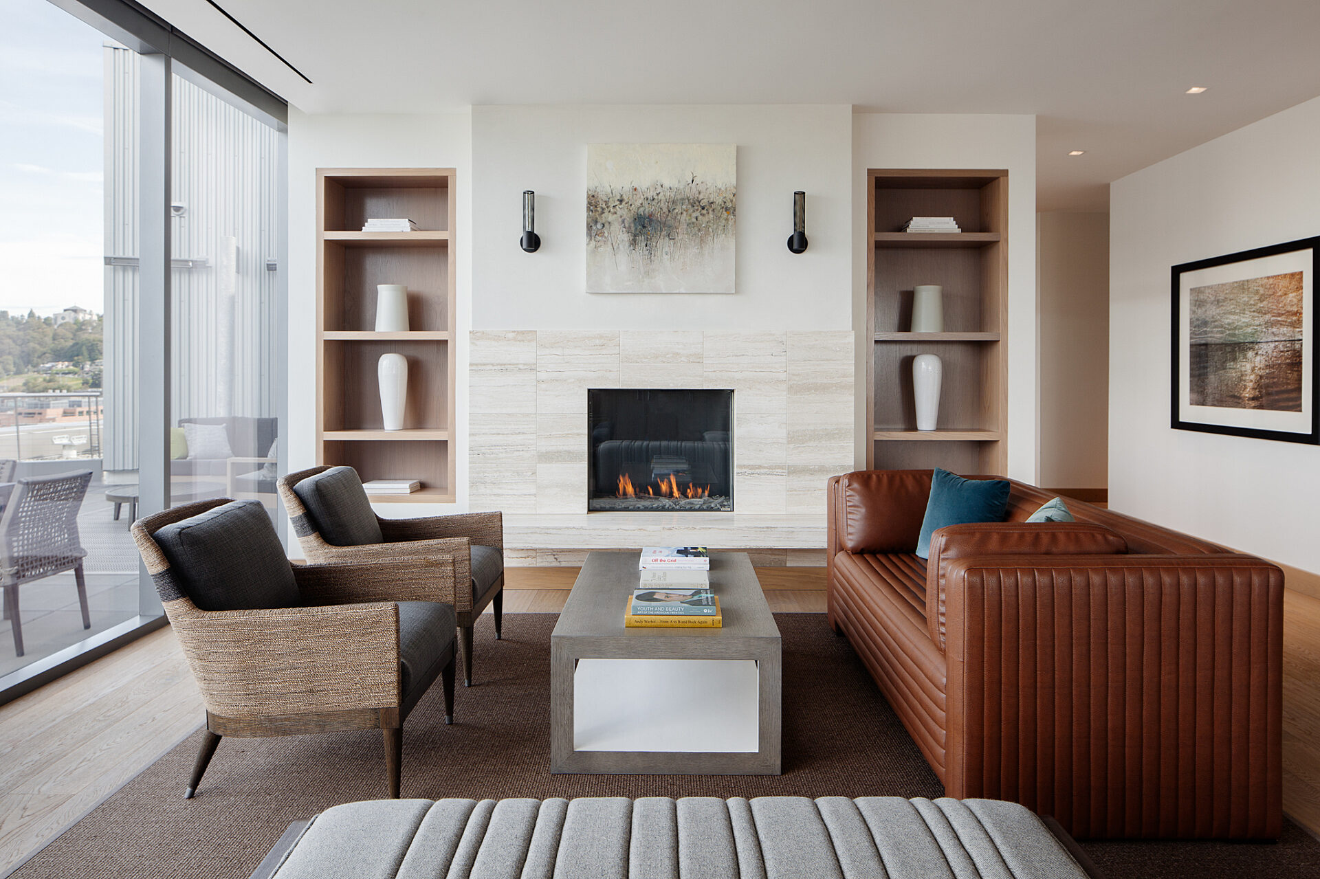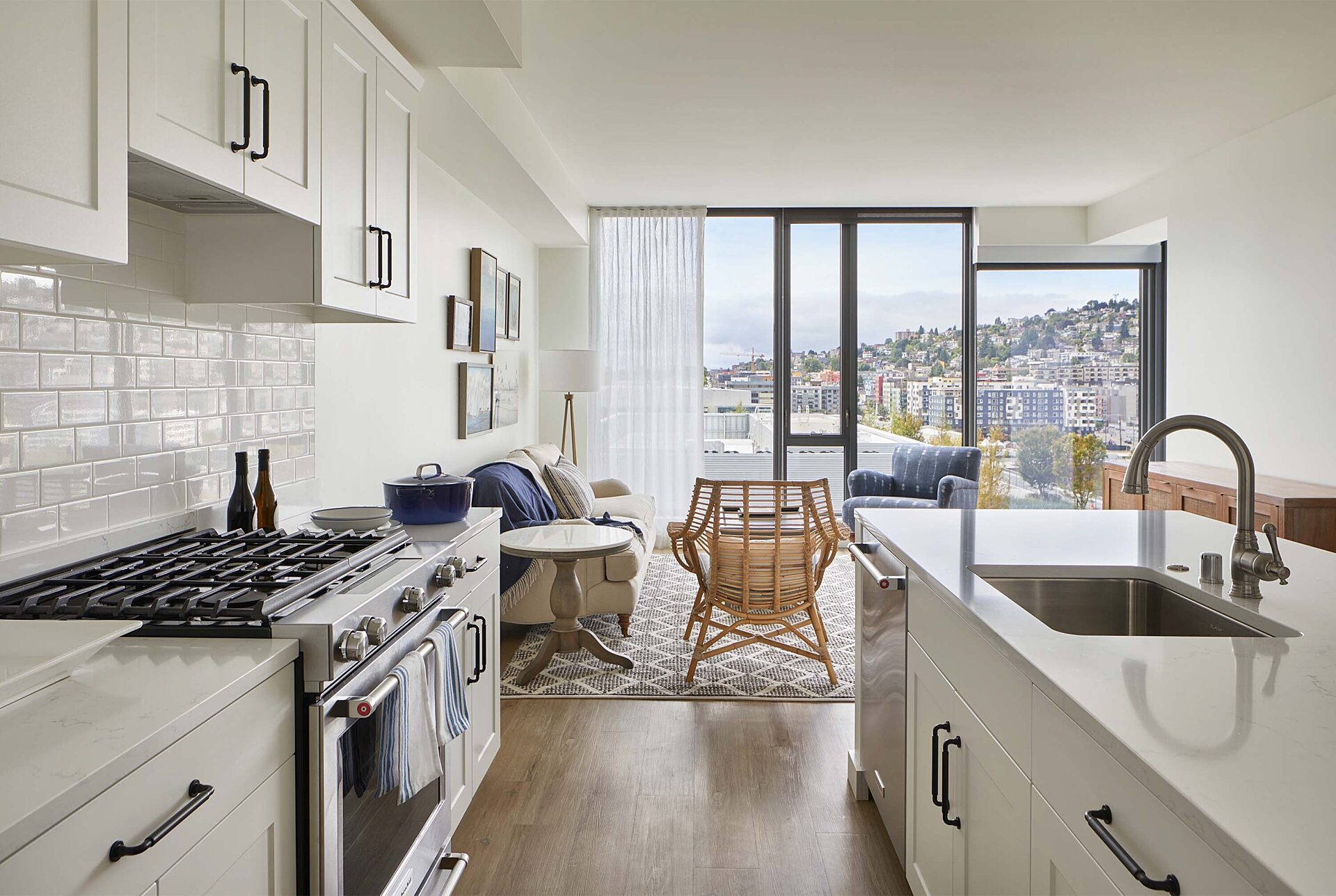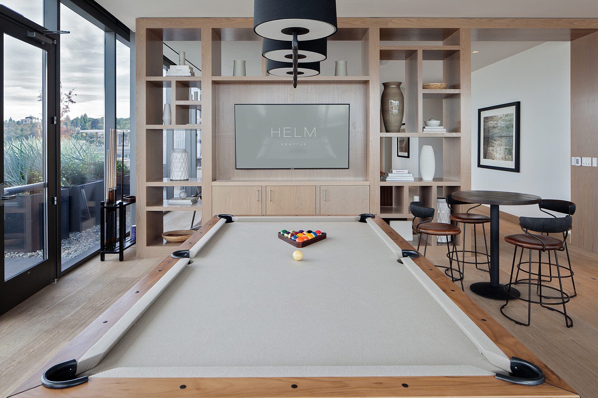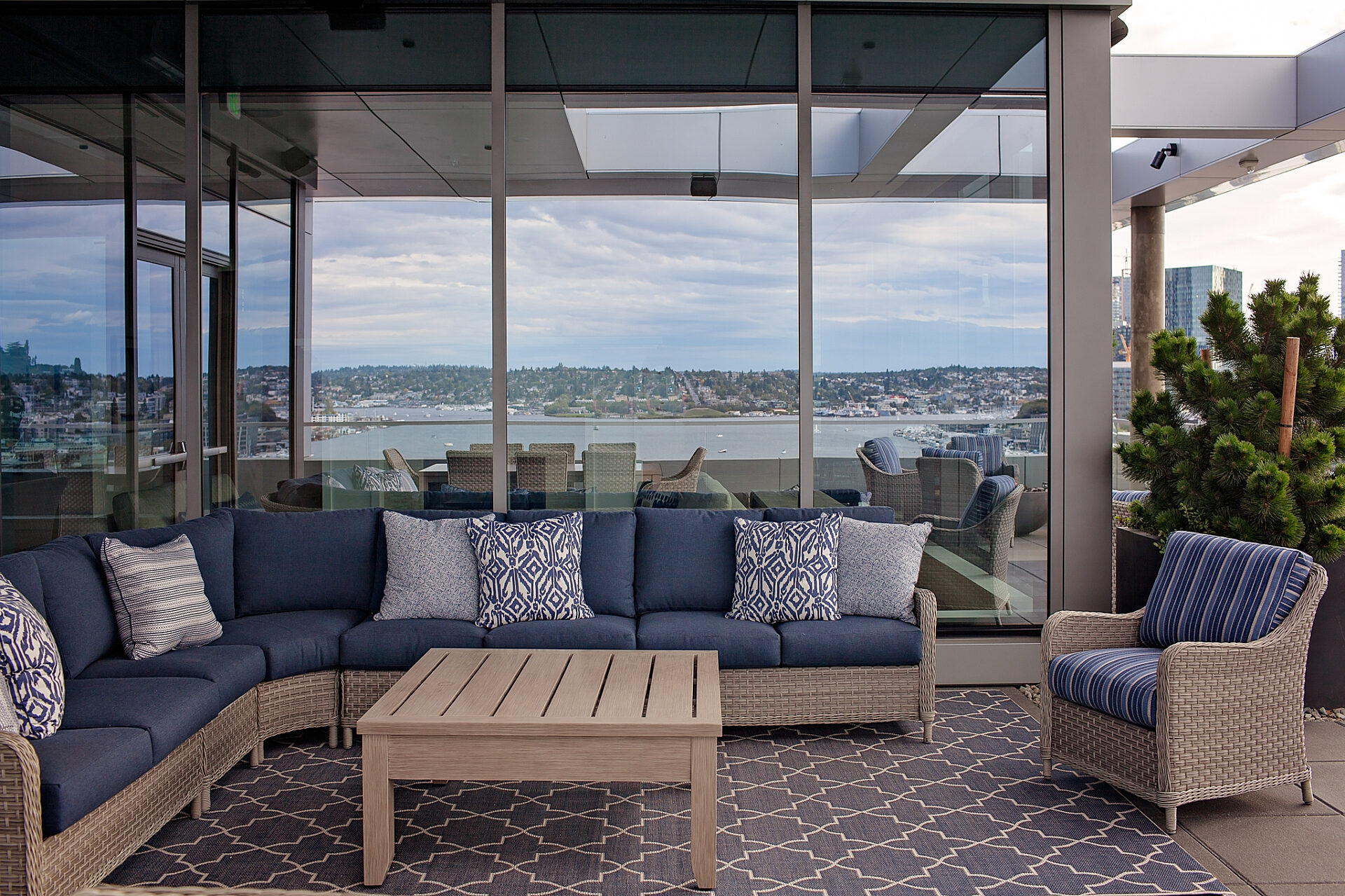 Residential towers—Helm and Mera—sit atop two of the buildings, offering 149 1- and 2-bedroom apartment units with penthouses on the upper floors. Amenity spaces include an expansive roof-top deck with a great room, workout facilities, dog run, dedicated elevators, and secured private vehicle and bicycle parking.