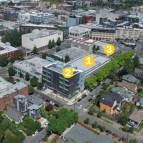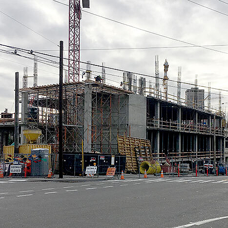 The team spent nine months coordinating with the key departments—Seattle City Light, Seattle Department of Transportation, King County Metro and communication providers Century Link, Comcast, G+L Utilities, Diversified, Verizon, Wave Broadband and Zayo—to devise a solution: a shoo-fly, which reroutes the lines to temporary poles across East Union for the duration of the project. During that time, the team worked on other areas of the site, which ultimately kept construction on schedule.