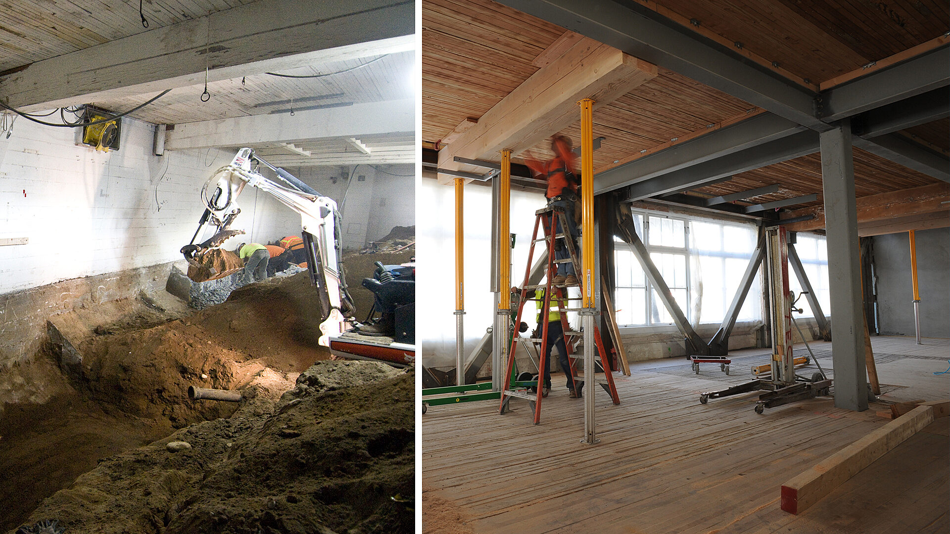 [L-R]: Reinforcement work at the Terry Avenue Building and Western Avenue Building shows how invasive seismic retrofits can be. In cases like these—requiring major foundation and superstructure upgrades—tenants must relocate temporarily.