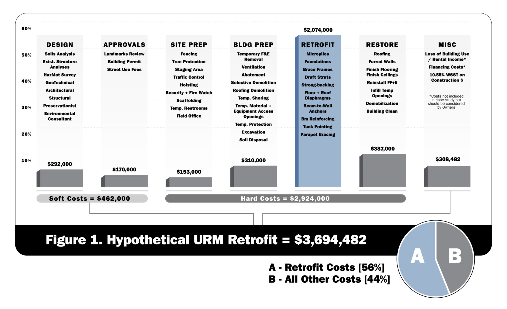 To better understand retrofit costs and solutions, let’s consider a hypothetical URM retrofit – see Figure 1. Hypothetical URM Retrofit = $3,694,482. The building in our example is typical of many URMs found in Seattle’s Pioneer Square, SODO, and CID neighborhoods: