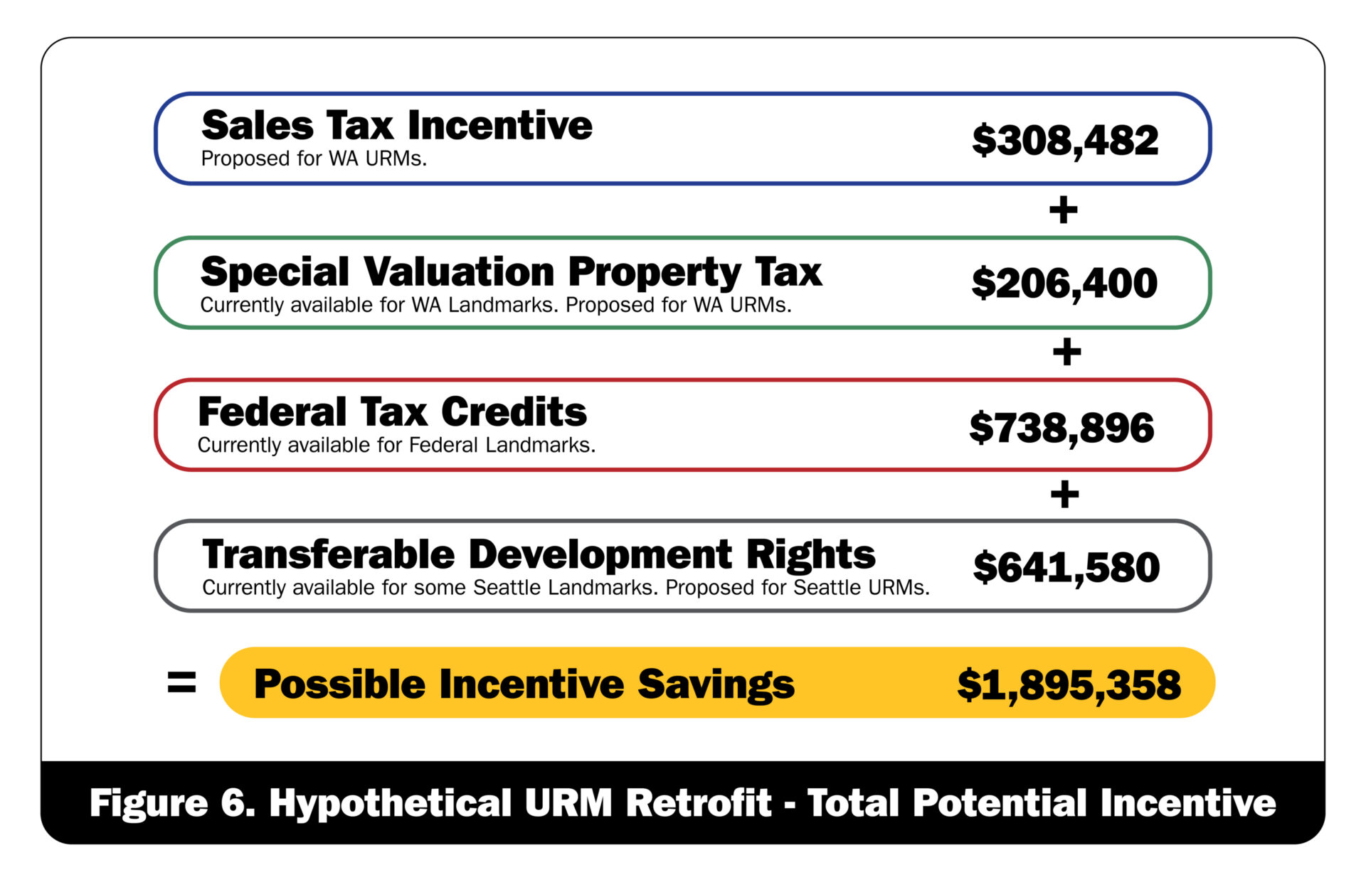 State and local incentives for our hypothetical URM retrofit are calculated in Figure 6. Hypothetical URM Retrofit – Total Potential Incentive. Total potential savings are $1,895,358—about 50%—of the total $3,694,482 retrofit cost. And with a more flexible TDR program, the total potential savings could be closer to $2.5M—about 68%—of the total retrofit cost.