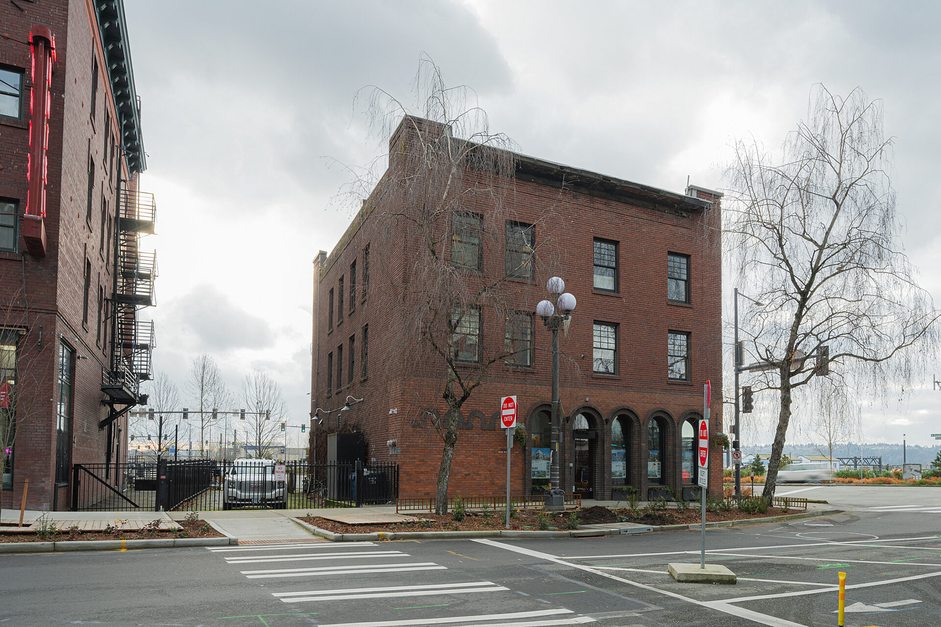 The constrained Western Avenue Building site in Pioneer Square required partial closure of the immediate sidewalk for scaffolding, dumpsters, and hoisting equipment as GLY completed extensive seismic improvements.