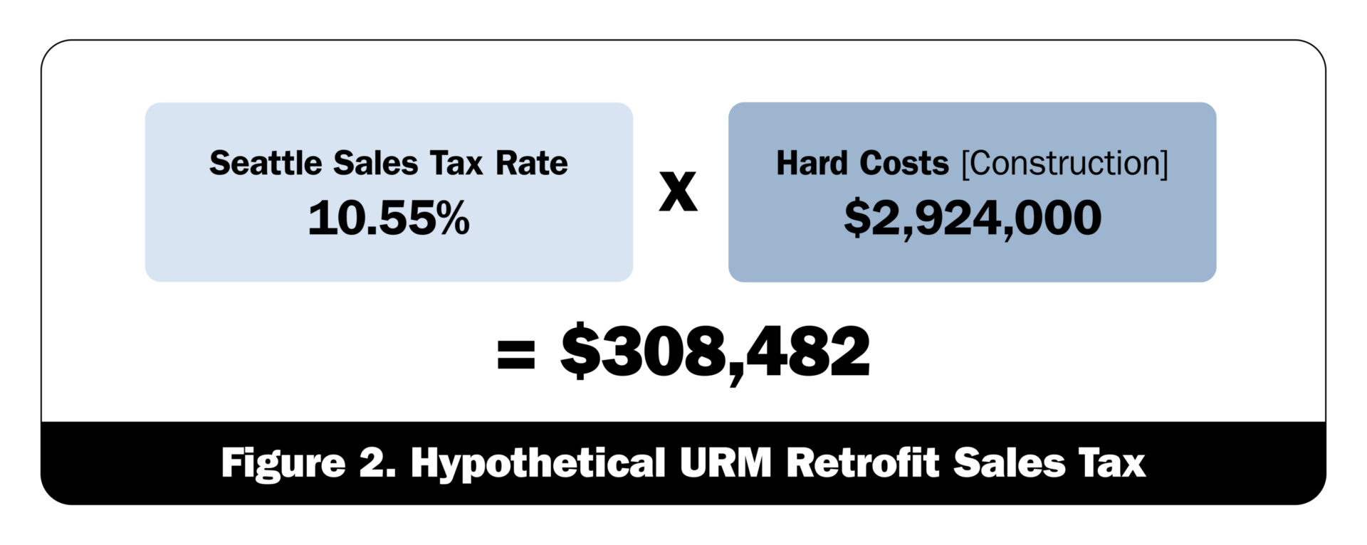 In our hypothetical URM retrofit, the roughly $2.9 million in construction costs would incur an additional $308,482 in sales tax – see Figure 2. Hypothetical URM Retrofit Sales Tax.