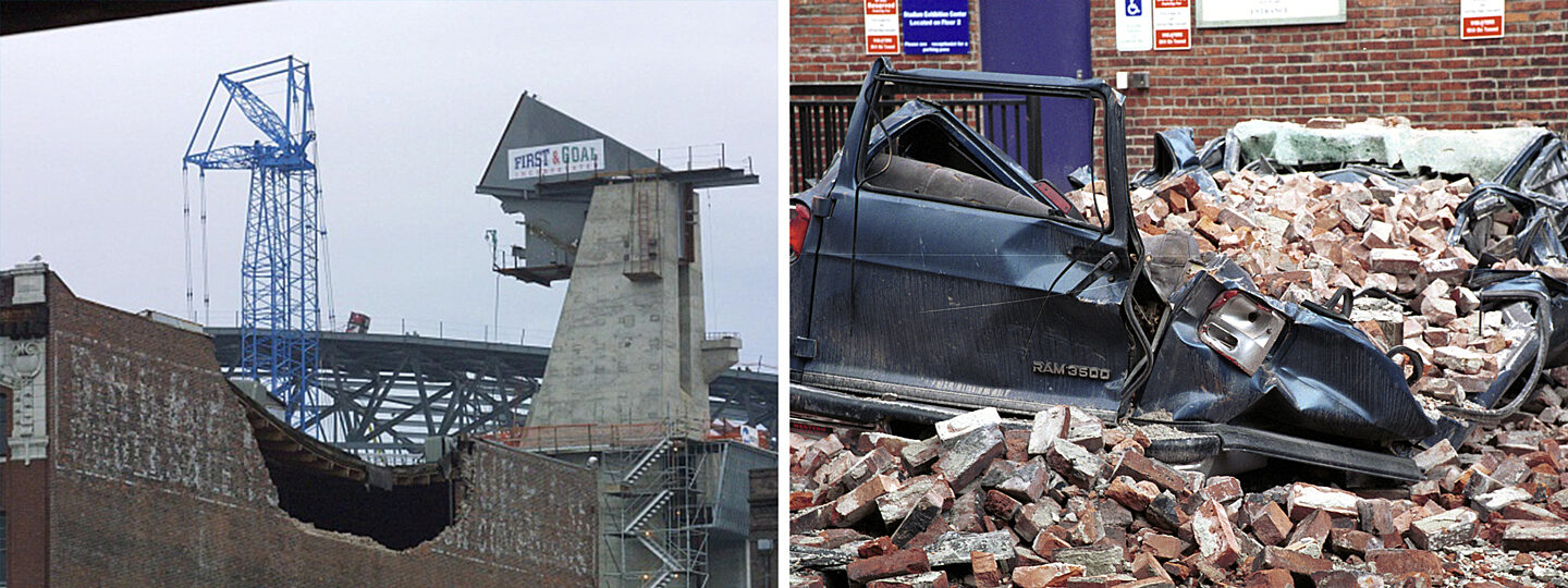 Gaping holes in URM buildings and piles of crumbled masonry are a common sight after large earthquakes. The images above were taken in downtown Seattle after the 2001 Nisqually earthquake. Photos: Left - Dan Levine / Stringer, Getty Images; Right - FEMA News, Kevin Galvin.