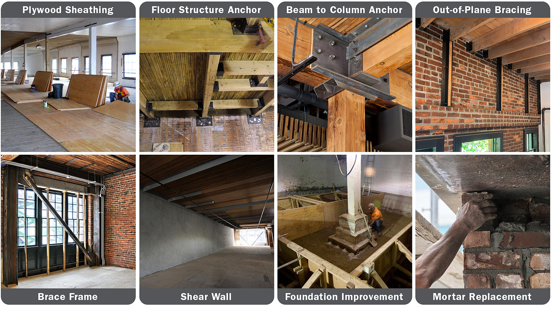 The scope of a retrofit addresses these lateral vulnerabilities while also shoring up the building’s vertical-load carrying elements such as foundations, columns, and walls. These upgrades include some or all of the following: