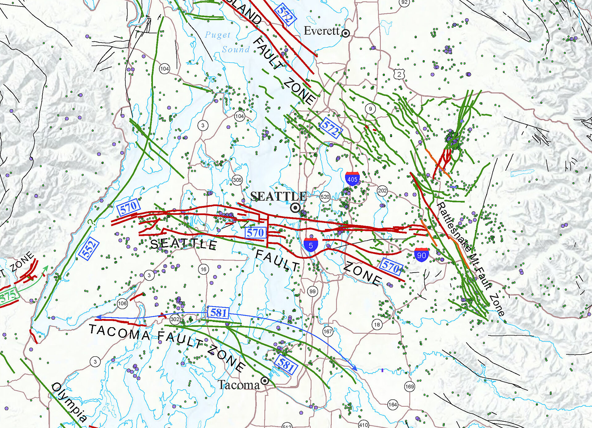 The above image shows faults located in and around Seattle. For a full map of Washington's faults, visit the 2014 report provided by the Washington State Department of Natural Resources.