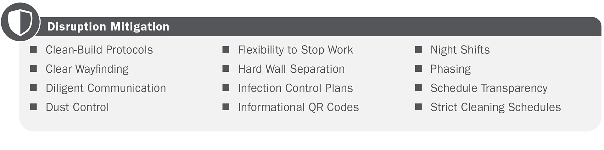 ISP employs a wide range of processes and tools to ensure business continuity—from sticky mats to minimize dust to strict infection control plans for critical care environments. A strategic phasing plan played a crucial role in minimizing disruptions for patients and residents during the Kline Galland Home's hospice renovation.