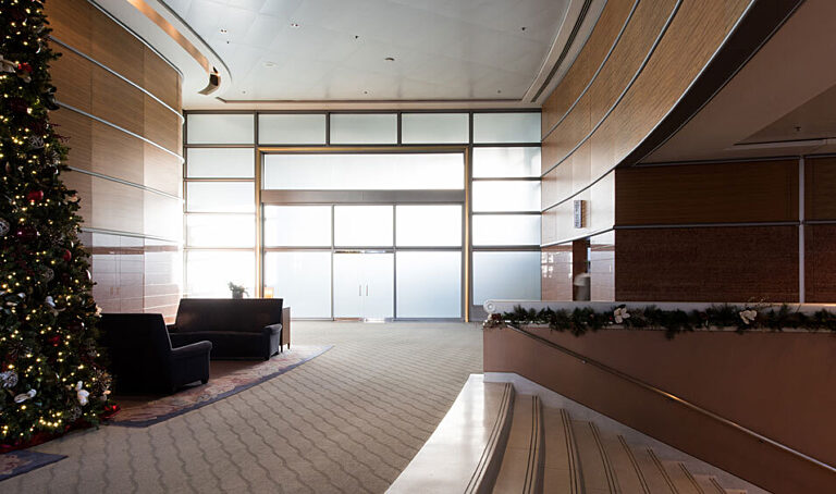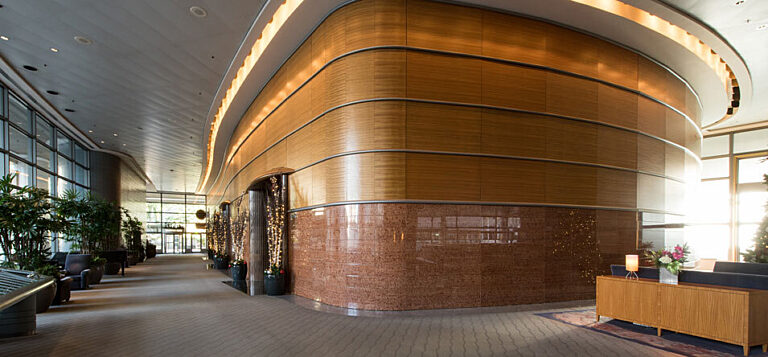 At the same time, like any makeover, it is important to preserve the original, timeless elements and characteristics that make the spaces what [or who] they are. It is a challenge that GLY and NBBJ embraced recently on Seattle’s Two Union Square. After two years of construction, owner Washington Holdings proudly revealed the final showpieces of the renovation, a 9,000 square foot parabolic wood beam ceiling and a 6,500 square foot 3D stone wall. Despite the dramatic change you see in the before and after photos below, the new space retains its mantle as a quintessentially Northwest building, just like it did in the 1980s.