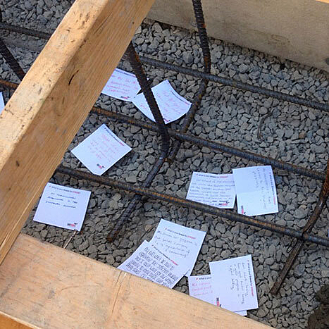 Donors, trustees and committee members wrote their well wishes for the building at the ground-breaking ceremony. students were able to place them in the mat footing to be buried in the concrete foundation.