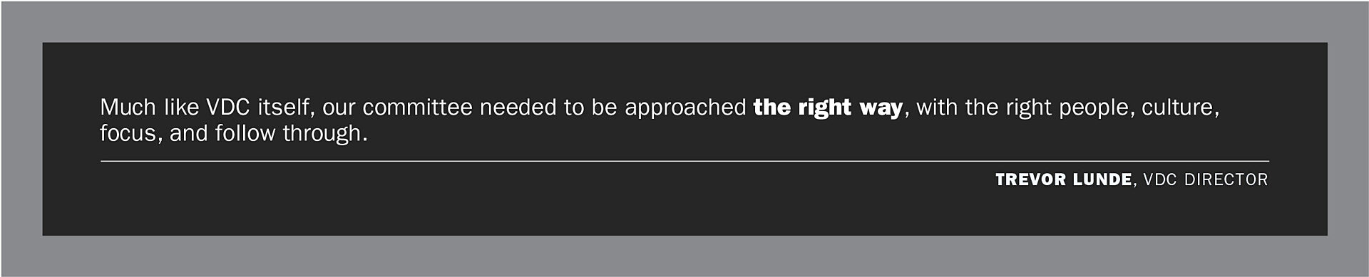 Much like VDC itself, our committee needed to be approached the right way, with the right people, culture, focus, and follow through.