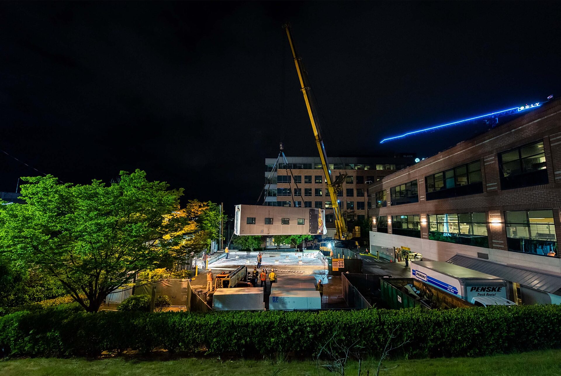 As part of this expansion project, GLY collaborated with ZGF Architects, Modular Resources, and many others on a one-story, 2,300 square foot prefabricated building to house MRI services. While the new tower expansion will feature four new MRI rooms to better serve patients, the client communicated the need for at least one additional MRI sooner than the tower’s completion date. The project was a perfect candidate for the prefabrication of the full building module, limiting on site work to site and foundation prep.