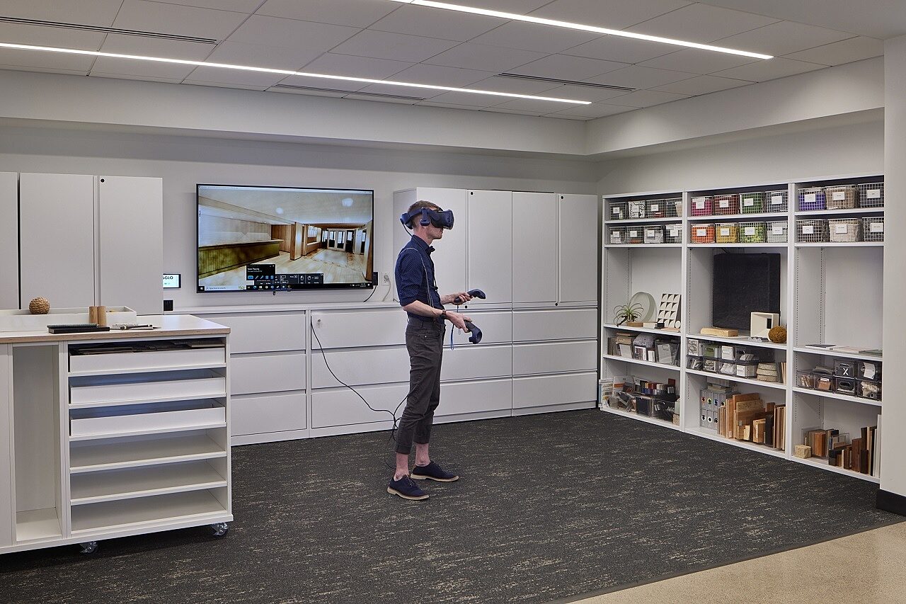 An inspiring materials library connects designers back to the essence of materials. It is curated around GGLO' s sustainability goals. Anything entering the library is the best-of-the-best and follows the idea of fewer, better things. It includes space for learning, teaching, display, and capability for integrated virtual reality.
