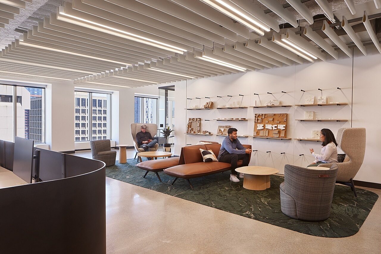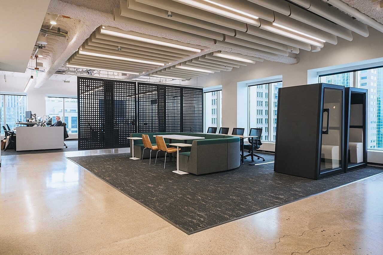 In contrast to their old office, which only had fixed desks, the new office features hot desks, window seat areas, private phone booths, and multiple seating options in the employee lounge, lobby, and kitchen areas. All private, semi-private and communal workspaces are kitted out with the latest A/V technology.