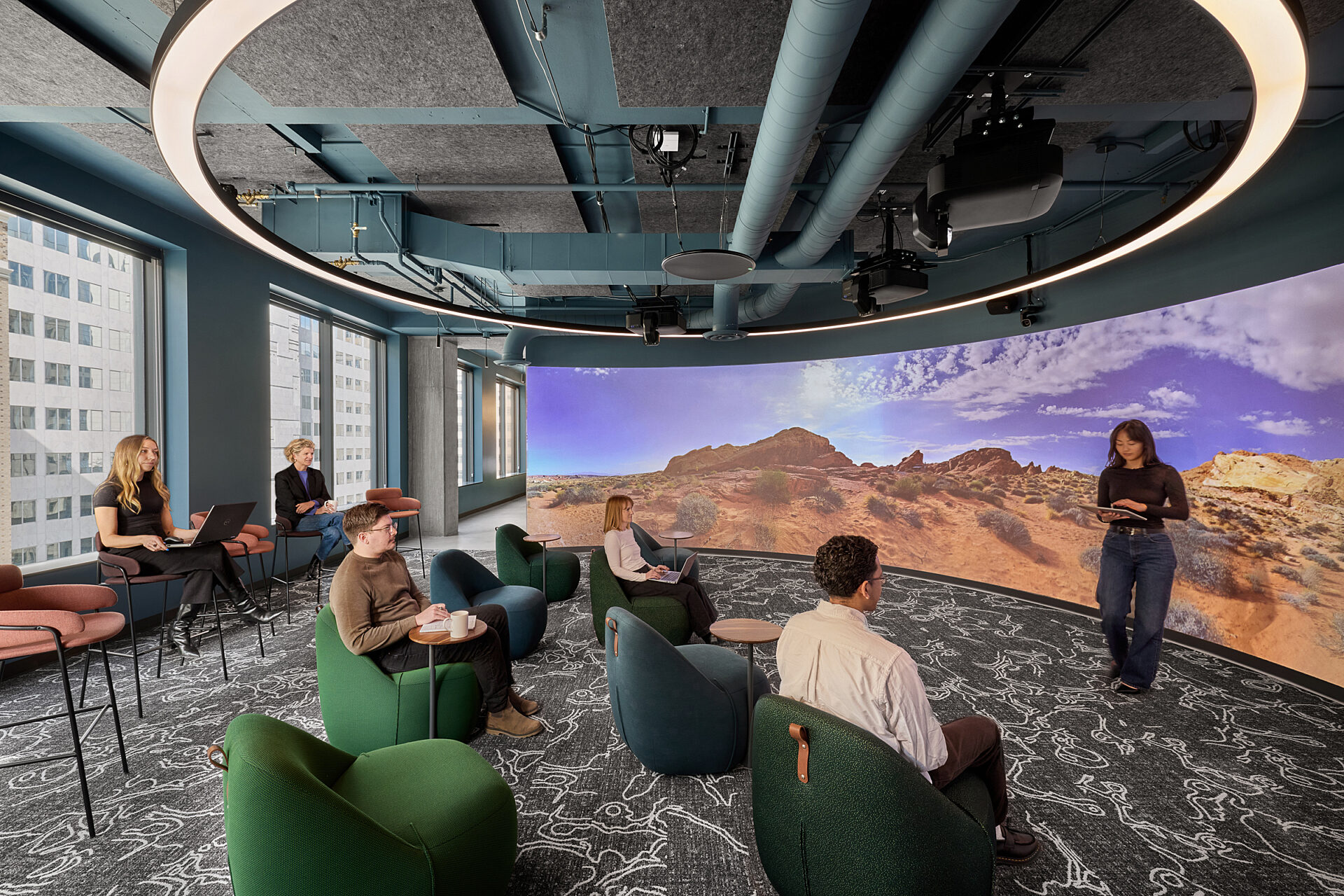 The layout includes a mix of open work areas, private focus rooms, small and large conference rooms, a wellness room, and a fully outfitted kitchen. At the heart of the space is the brainsphere, a high-tech presentation and collaboration zone featuring three overlapping projectors that light up a curved wall with immersive visuals. Exposed ceilings and custom millwork give the space a modern, yet warm and welcoming vibe.