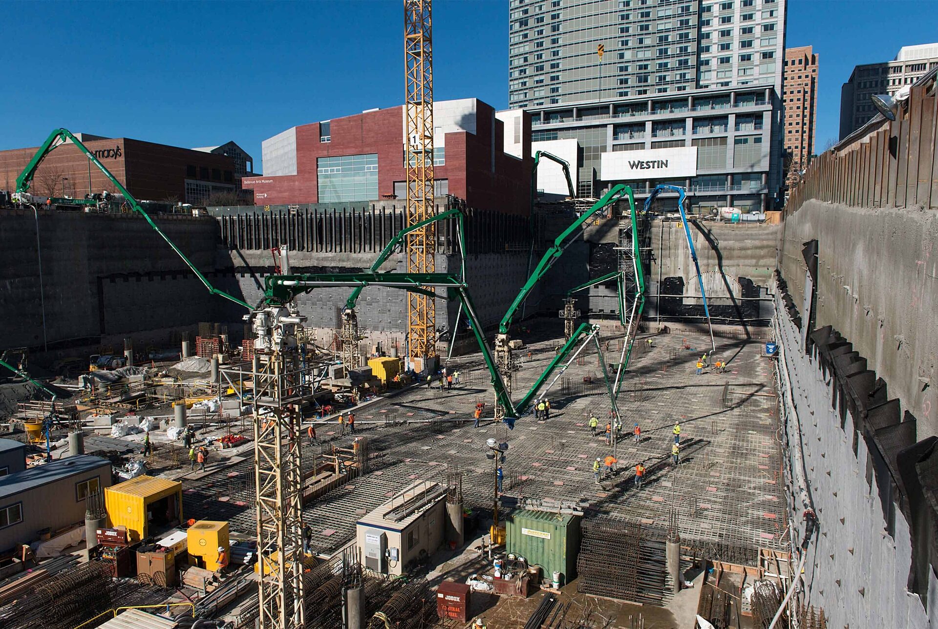 At 13,690 cubic yards, the north tower’s mat foundation holds the record for the state’s largest continuous concrete pour, previously set by the south tower mat pour [13,400 cubic yards].
