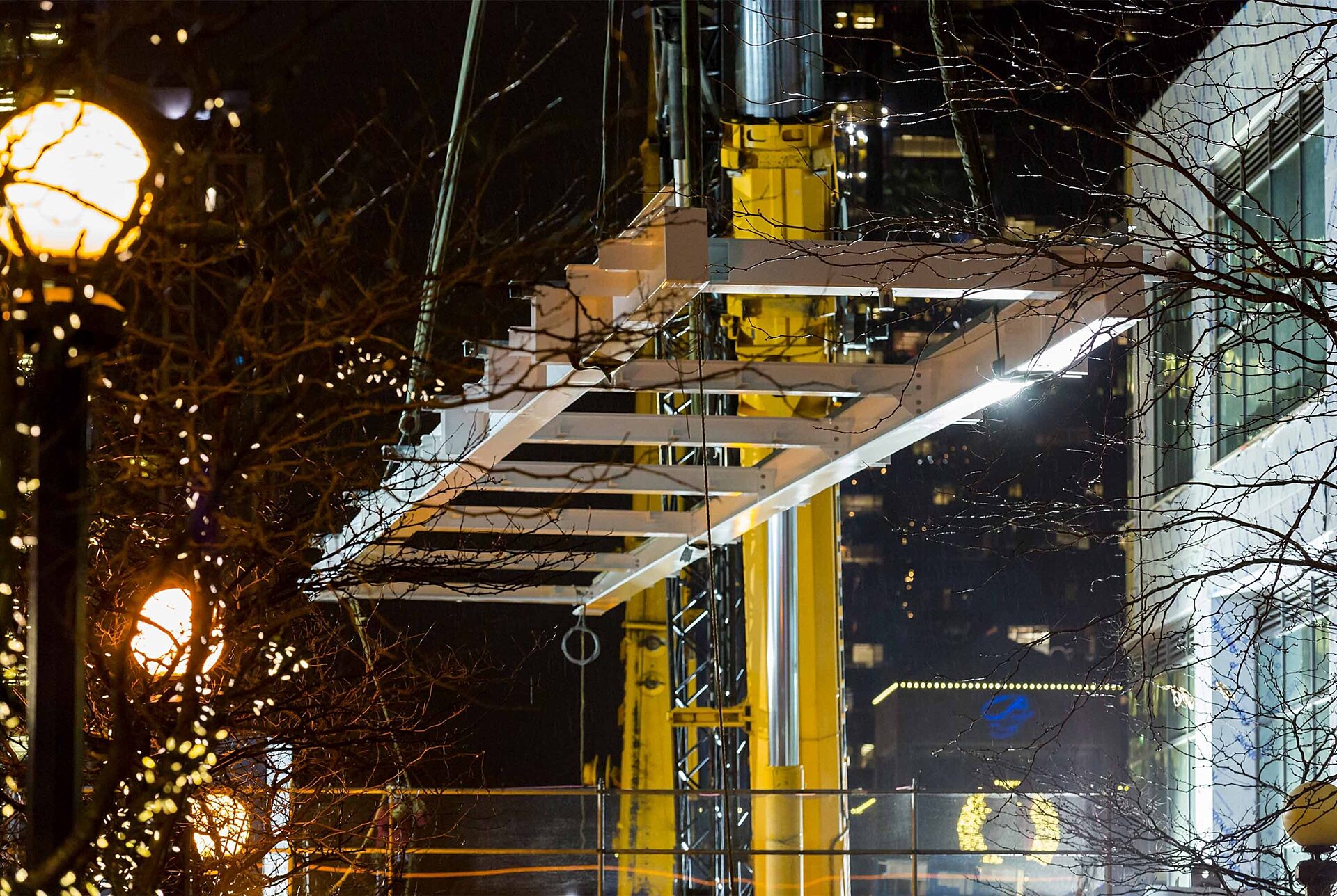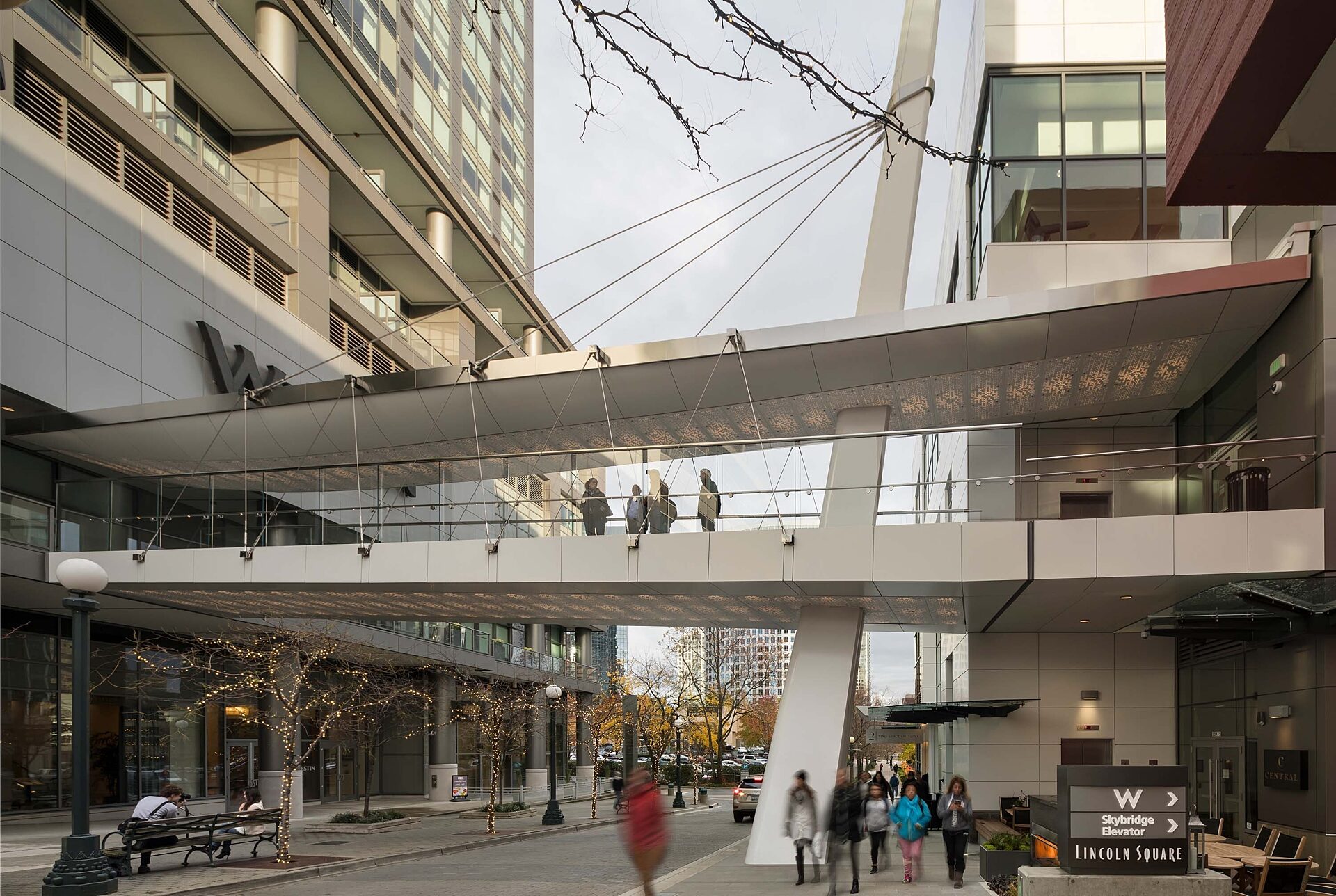 A sky bridge was installed to connect the Lincoln Square Expansion to the neighboring Westin hotel. Crews worked overnight on a Friday into the early morning on Saturday to install the bridge in order to minimize disruption to the area.