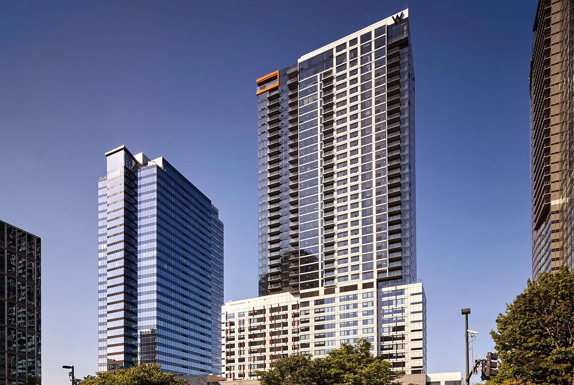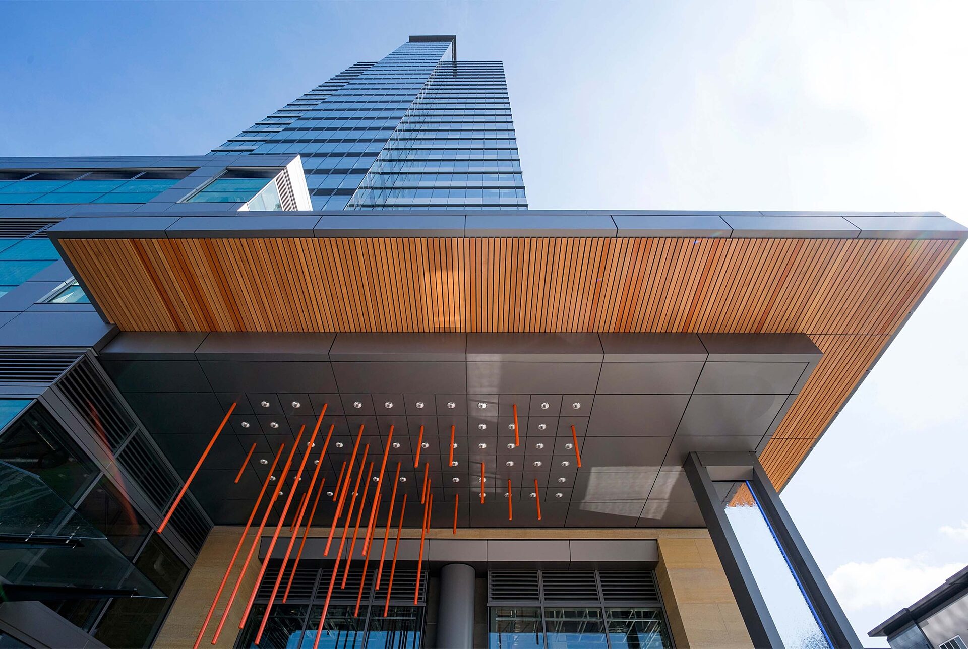 The development includes a 41-level hotel and residential tower, 32-story office tower, three-level podium commons area, and six levels of below-grade parking providing over 1,800 stalls. A skybridge connects the new podium to the neighboring Westin Hotel.