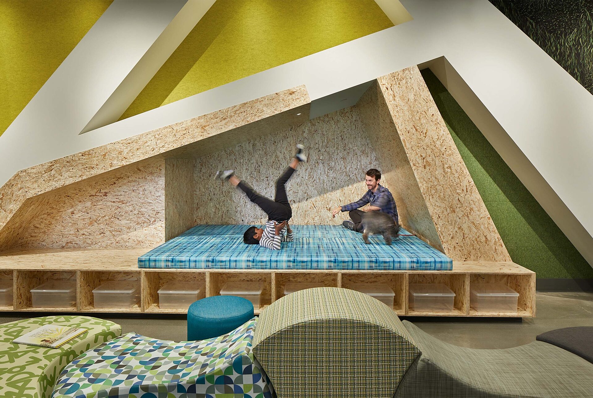 Unique to this new Burien shelter is its co-located campus developed with Mercy Housing Northwest. The site includes 90 permanently affordable housing units, 30 of which are reserved for families transitioning from shelter to stable housing. The apartments are designed by SMR Architects and built by Walsh Construction.