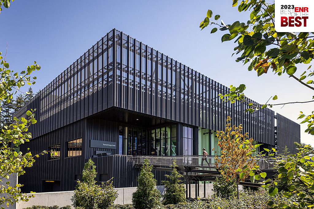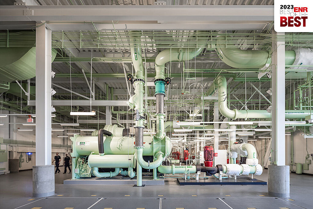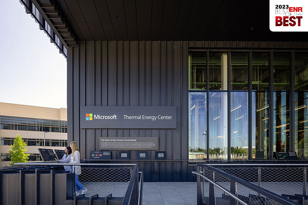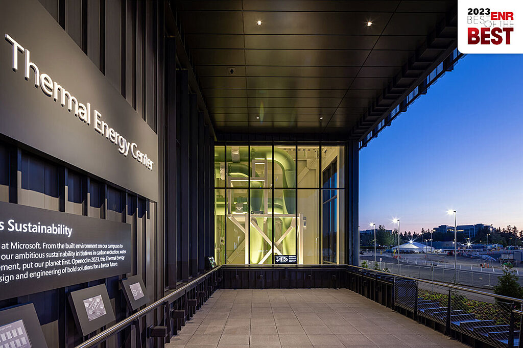 The MEP-intensive Thermal Energy Center [TEC] project located at Microsoft’s Redmond, Washington headquarters is a highly sustainable alternative to a traditional large campus central utility plant. The centralized heating and cooling system, fueled by a 6.5-acre field of 900 geowells, utilizes the Earth’s thermal energy and disperses 850,000 gallons of water to control campus temperatures. The TEC also leverages other clean energy systems such as solar panels, chillers, thermal energy storage tanks, and cooling towers. Affectionately known as The Machine in the Woods, the TEC aims to reduce campus energy consumption by 50% and water use by 8 million gallons.