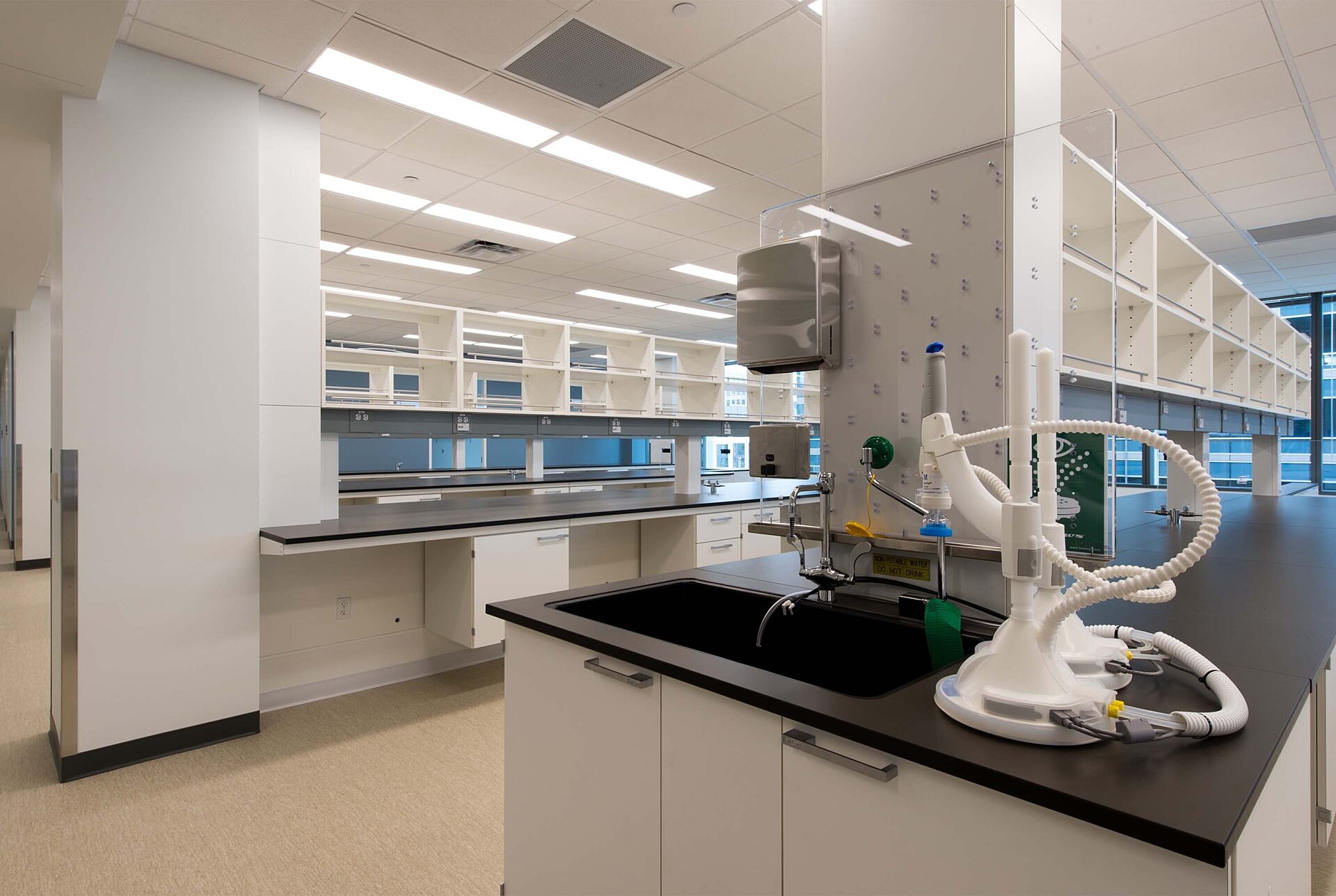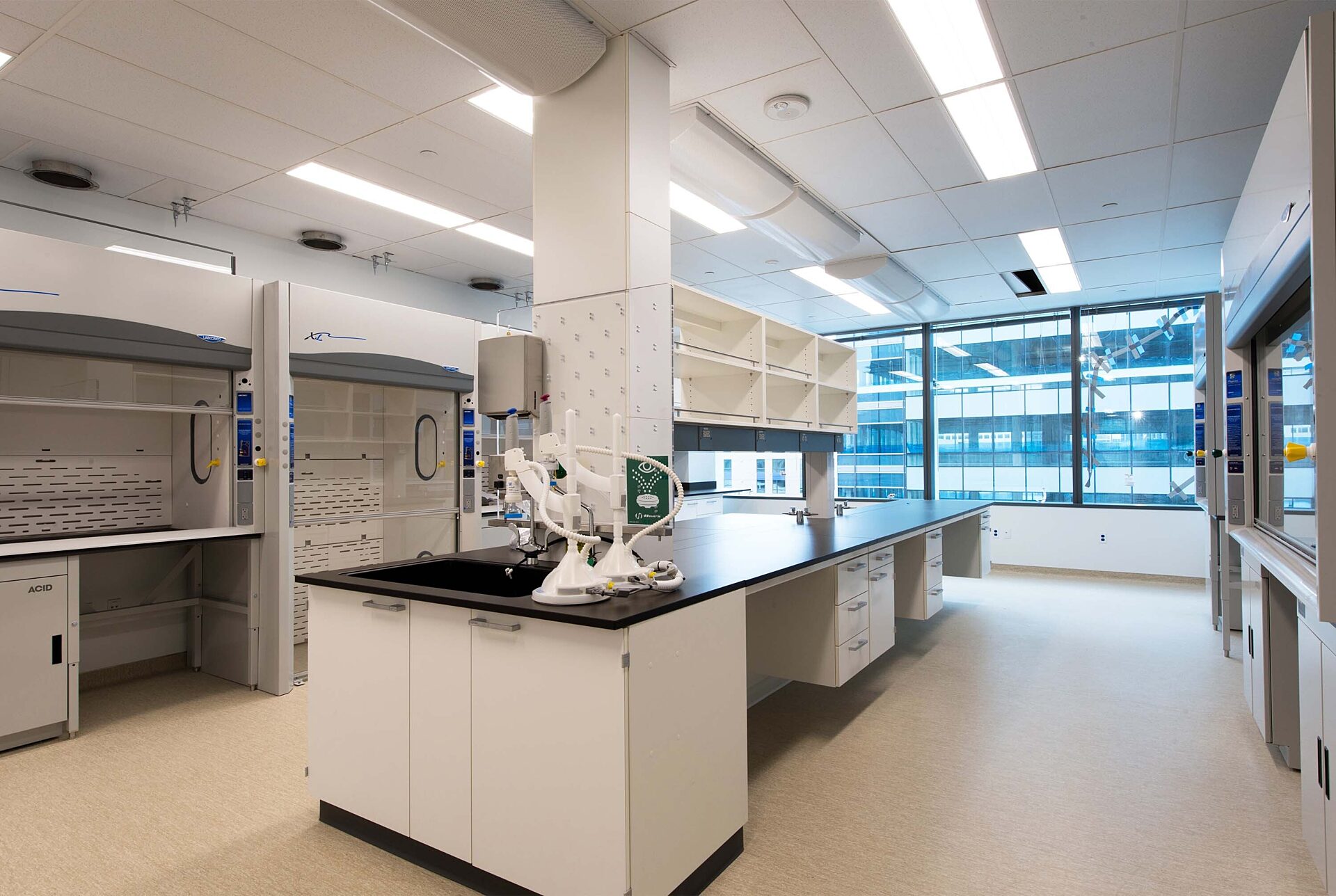 The first floor laboratory tenant improvement within the new seven-story 500 Fairview building [Vue Research Center] includes two chemistry labs, an analysis purification lab, synthesis purification room, chemical storage room, glass wash room, gas storage closet, mechanical room and a freezer hallway. Special features: