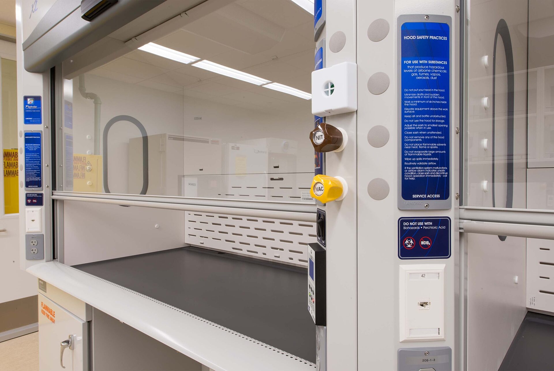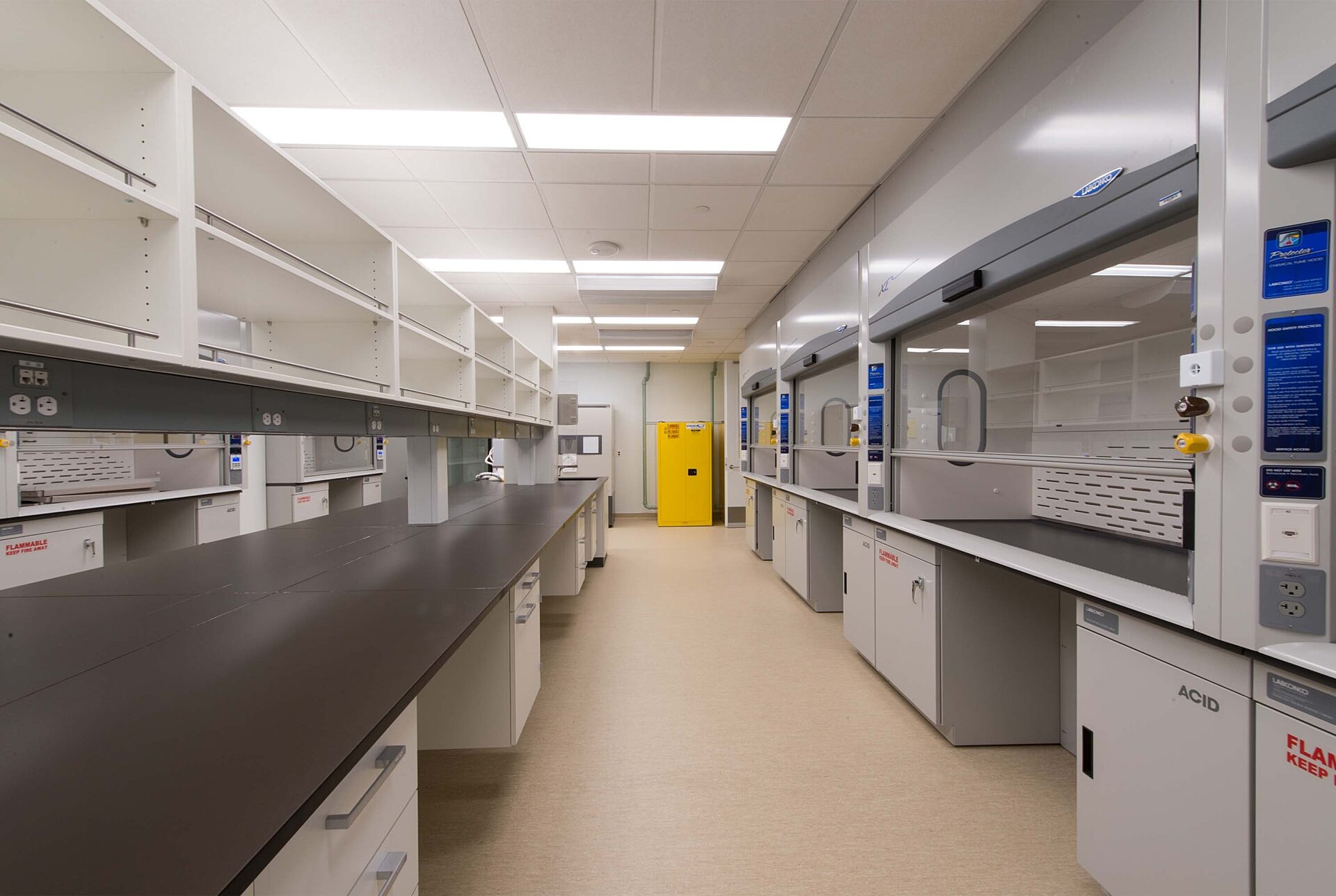 The Novo Nordisk Room 511 Lab was converted from a freezer farm to a wet lab. The conversion included renovation of the room’s existing lab benches, and the installation of a large robotic freezer unit. Further improvements included: new lab benches, a base sink cabinet, a bio-safety cabinet, centrifuge, ceiling tiles, and painting throughout.