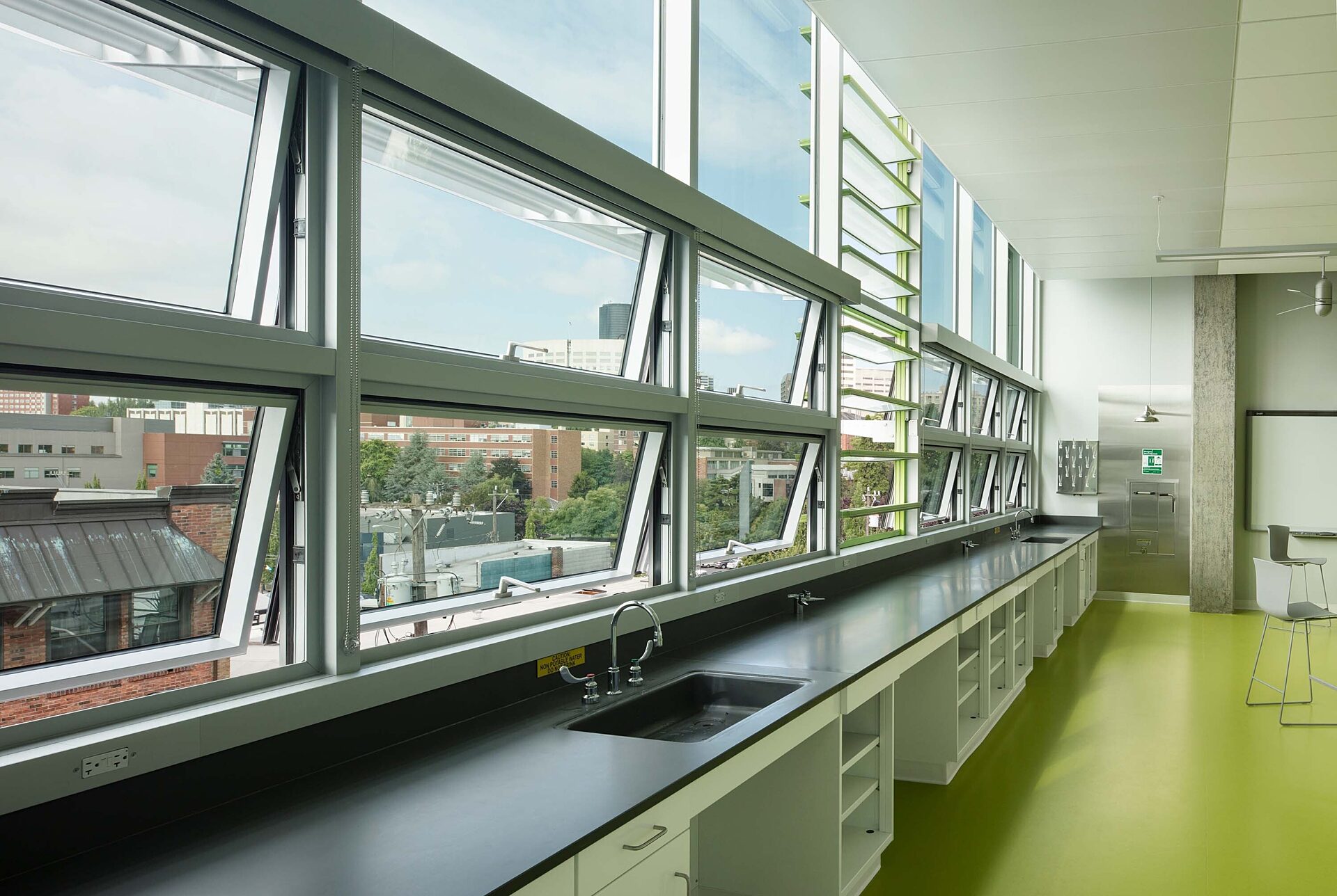 To exceed LEED Gold standards, the building utilizes power from photo-voltaic panels and features a green roof atop a new breezeway, connecting the existing Arts building to the STREAM building. Additional sustainable features include a 12,000 gallon cistern for rain water harvesting, hydronic ceiling panels, radiant heat floors, and passive cooling.
