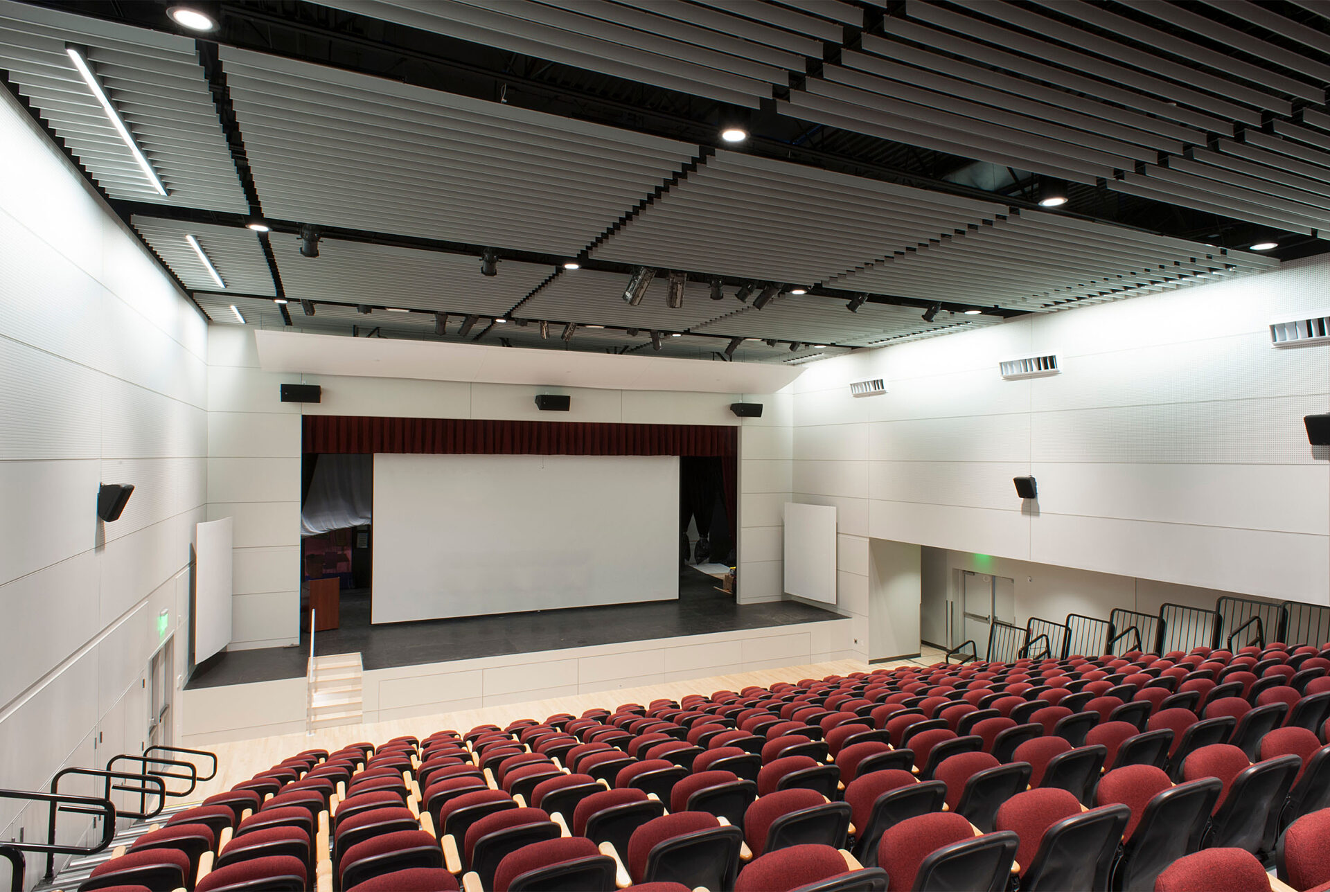 The upgraded auditorium includes all new retractable seating, a theatrical performance stage, audio-visual systems and house lighting, windows, skylights and finishes. The foyer and library feature new finishes and a storage area. Scope also included a new roof system for the entire SJCC campus and retrofitting the existing ECS preschool classrooms with a fully functioning fire protection and alarm system.