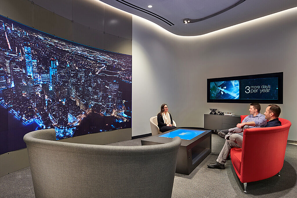 An existing warehouse shell is now a sleek, futuristic conferencing and Audio/Visual display masterpiece complete with full-height touchscreen AV equipment, award-winning molded curved drywall ceilings, custom milled MDF wall finishes, 300 high-end video displays, cabinetry, and back-of-house facilities. Equipment required three miles of data/AV cabling and highly variable air conditioning for cooling 300,000 to 1,000,000 BTYs/hour heat loads. Despite the extent of the AV requirements, systems are controlled by one simple, single tablet.