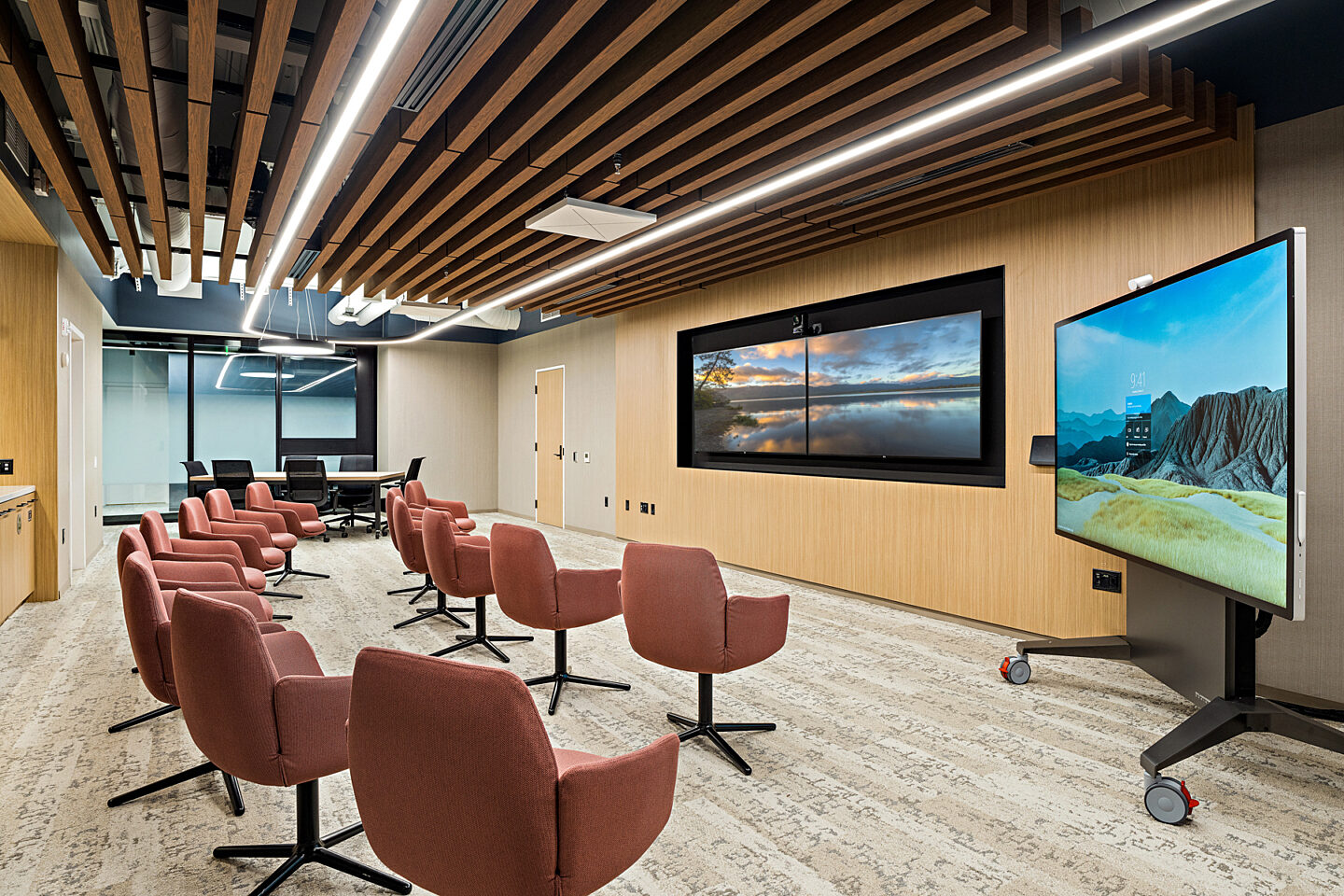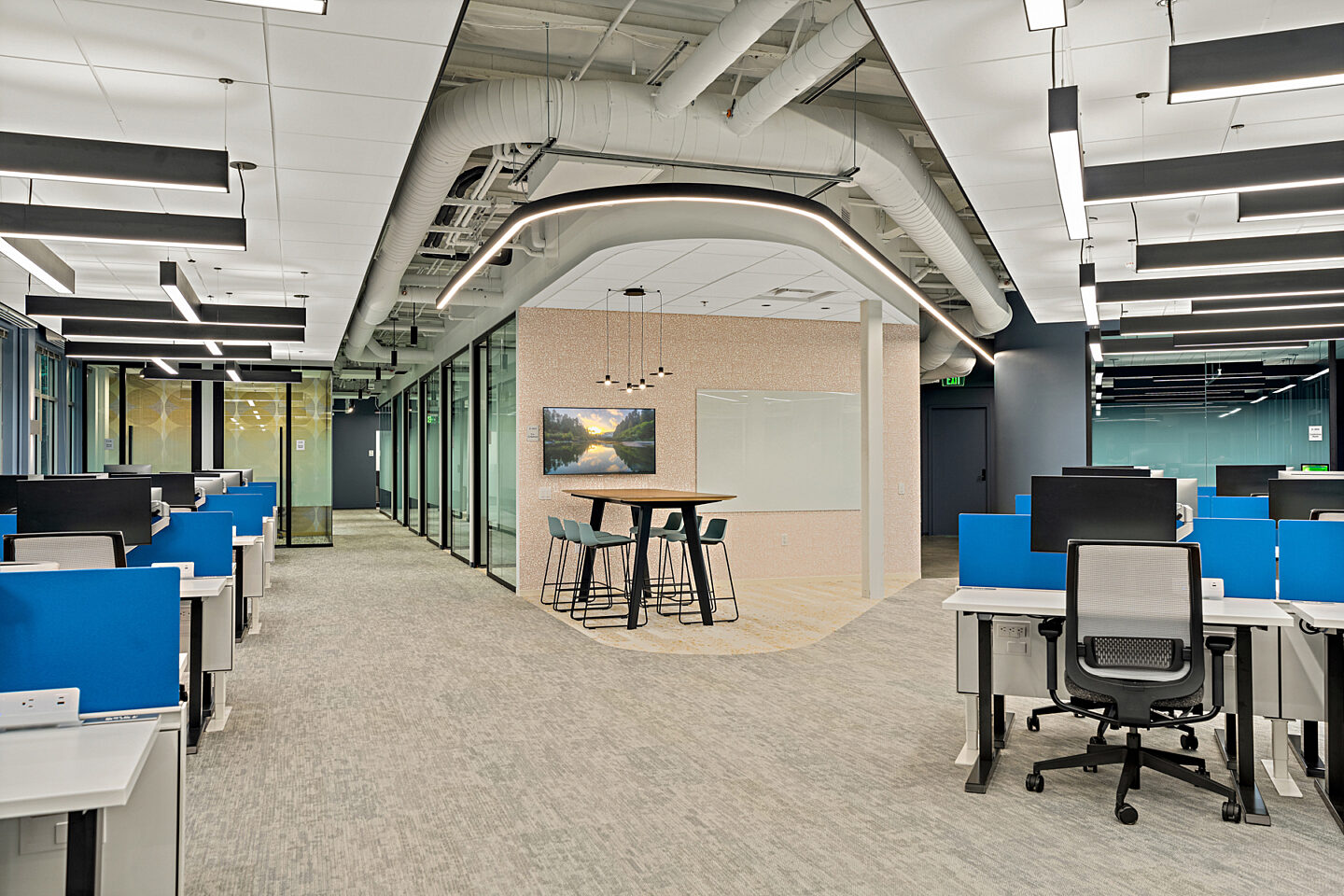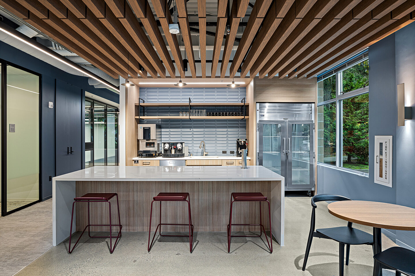 The new offices for a leading technology consultant firm maximize the abundant natural light and offer employees uninterrupted views of the surrounding trees, creating a quintessentially Pacific Northwest ambiance.