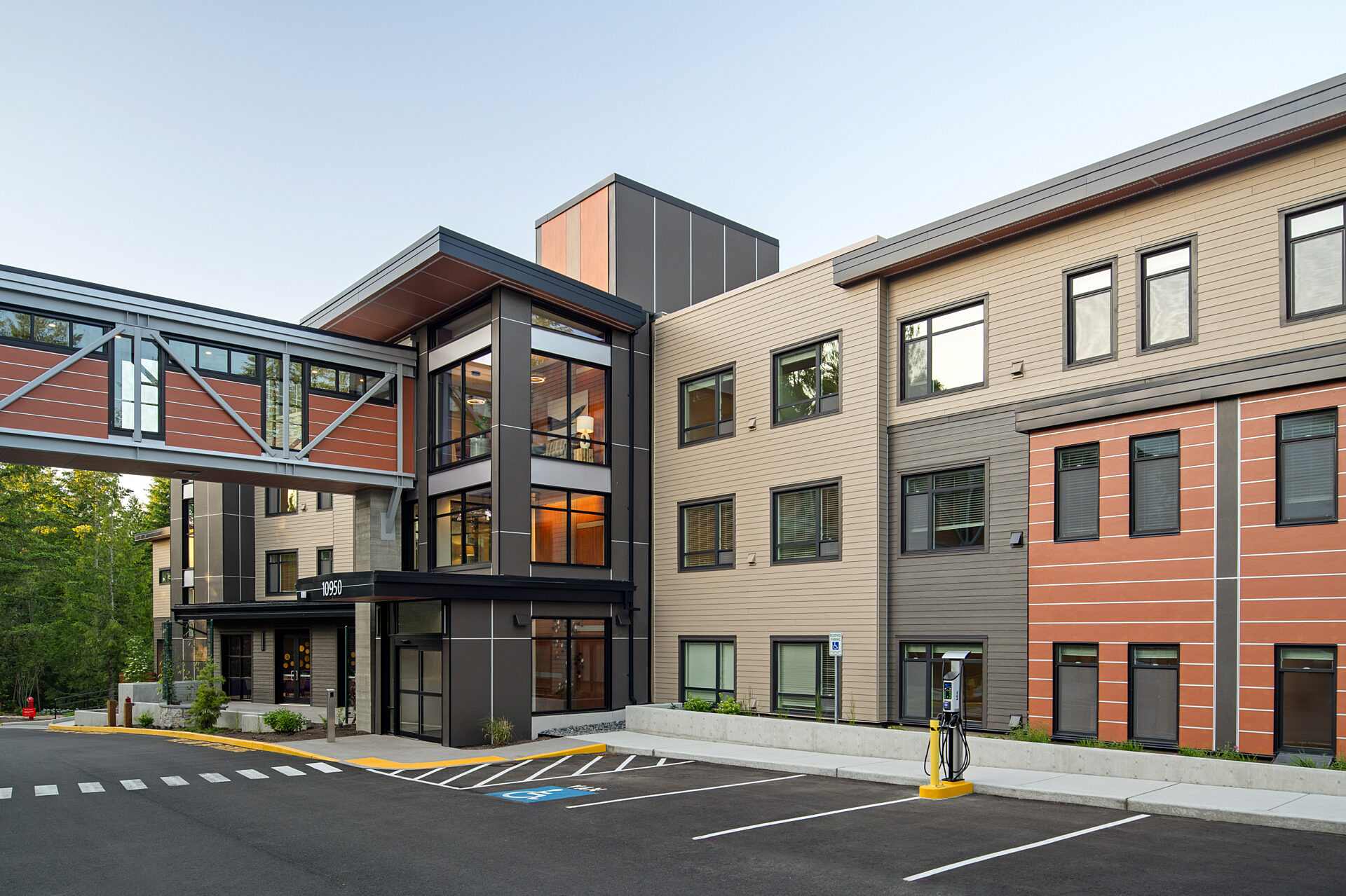Situated on 9.5 acres at the base of Cougar Mountain, it is the first high-rise project in the City of Issaquah. A seven-story tower sits above a three-level parking garage for a total 473,200 SF within a compact 75,000 SF footprint.