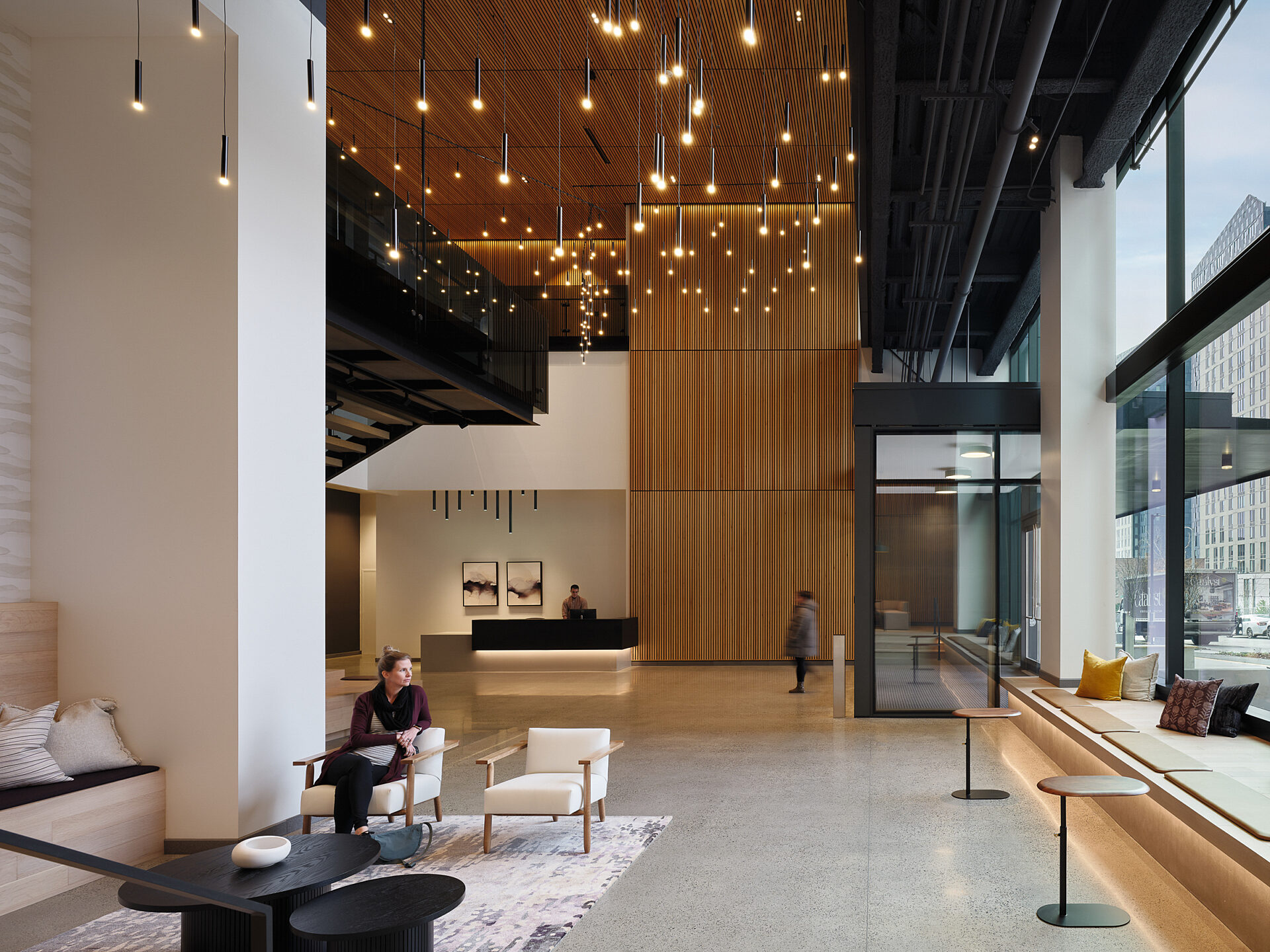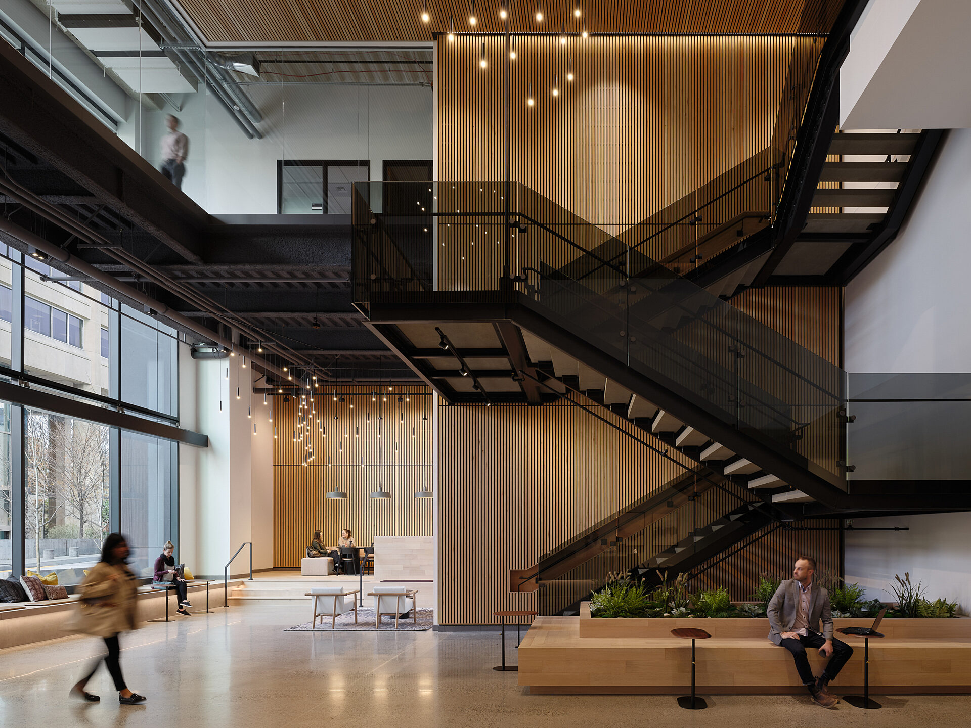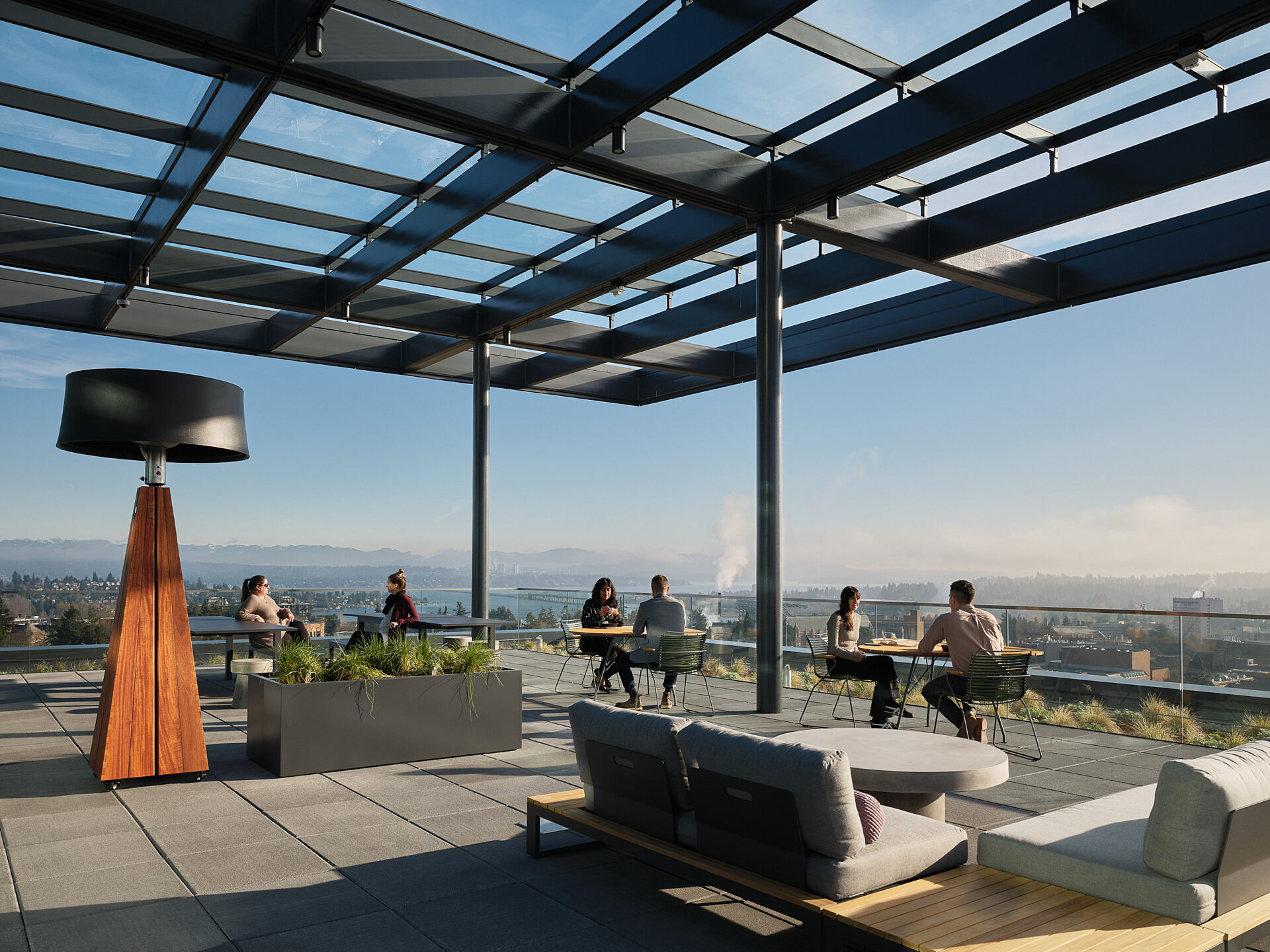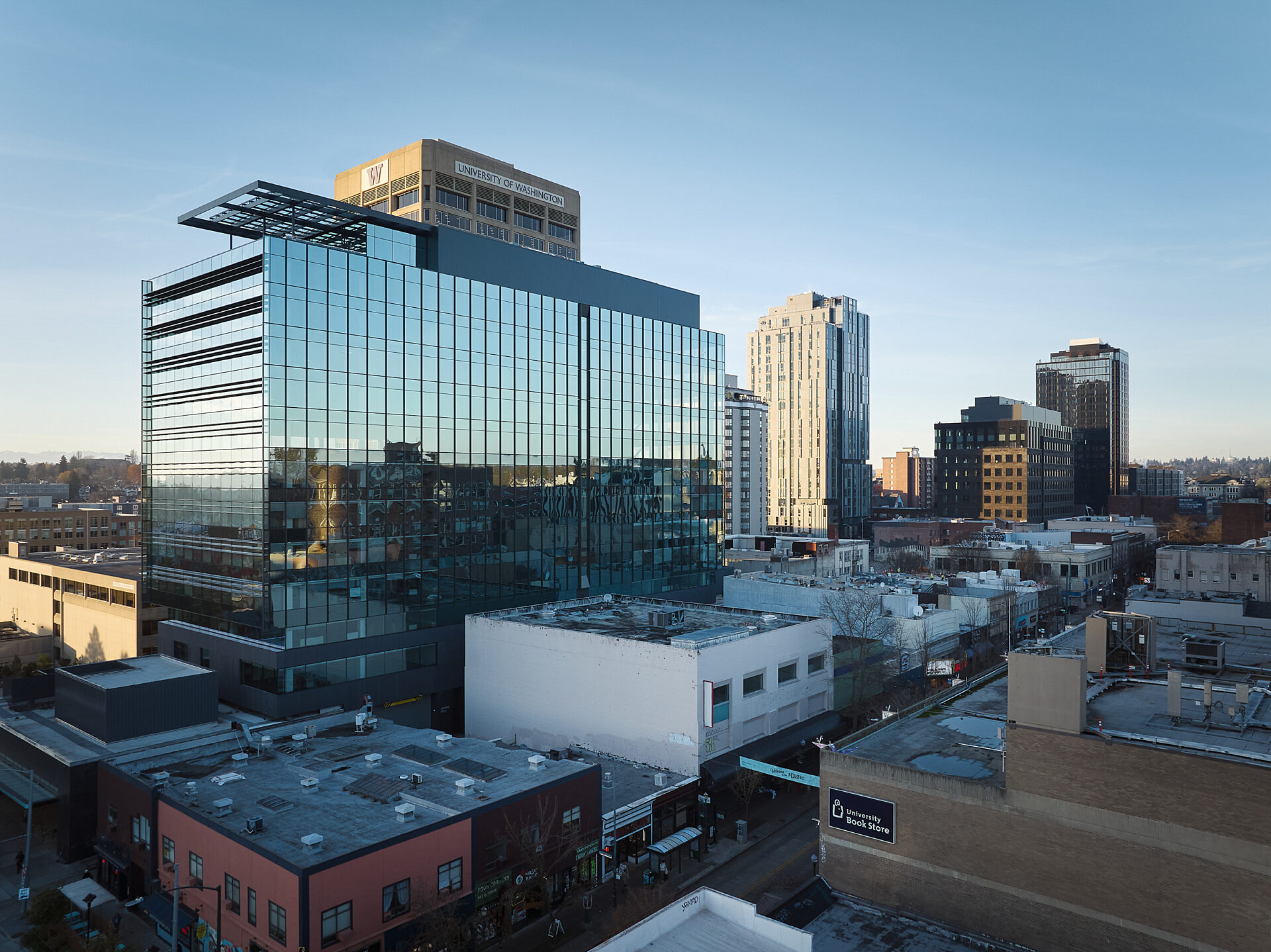 In addition to office space, the Gateway Building features ground-floor retail, bike storage, shower rooms, a L13 amenity space with access to a rooftop terrace, a green roof with a 60 kW photovoltaic array, and a public pocket park located on the corner of Brooklyn Ave NE and NE 43rd St.