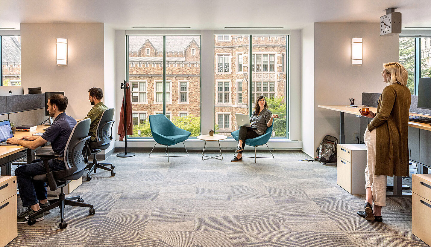 Phase 2B: Retrofit 16,000 square feet of vacated space within the Allen Library South 1st floor for iSchool programs with connections to UW Libraries [e.g. digital and open scholarship, knowledge systems, and data science]. The new space features offices, collaboration and team building areas, and a kitchenette.