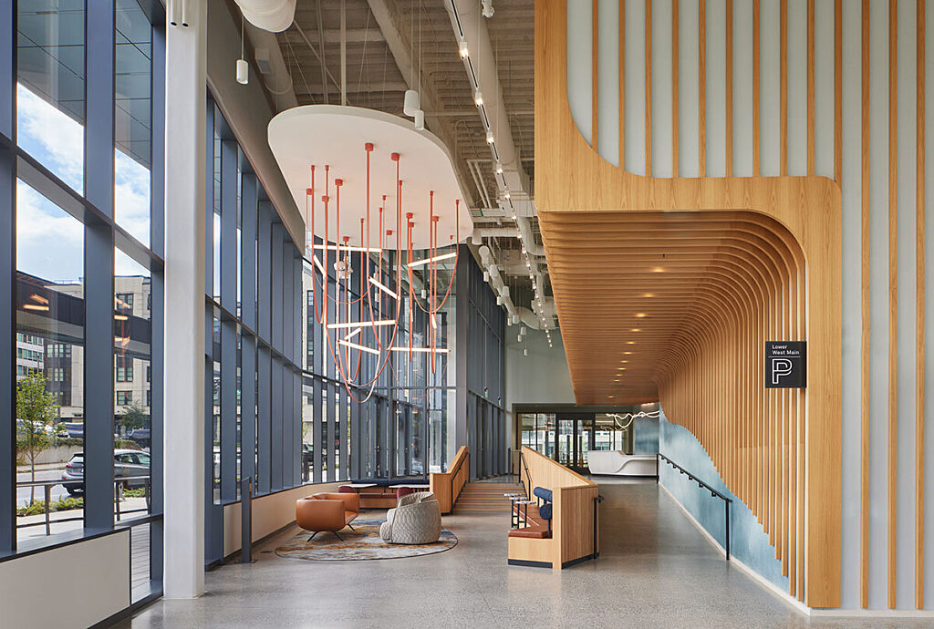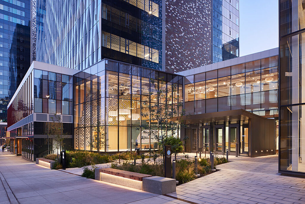Located in downtown Bellevue, the mixed-use office + retail West Main development, anchored by Amazon, is an ensemble of three buildings organized around a common podium and thru-block. The project enhances the adjacent streetscapes and provides pedestrians with open space amenities and various retail offerings.